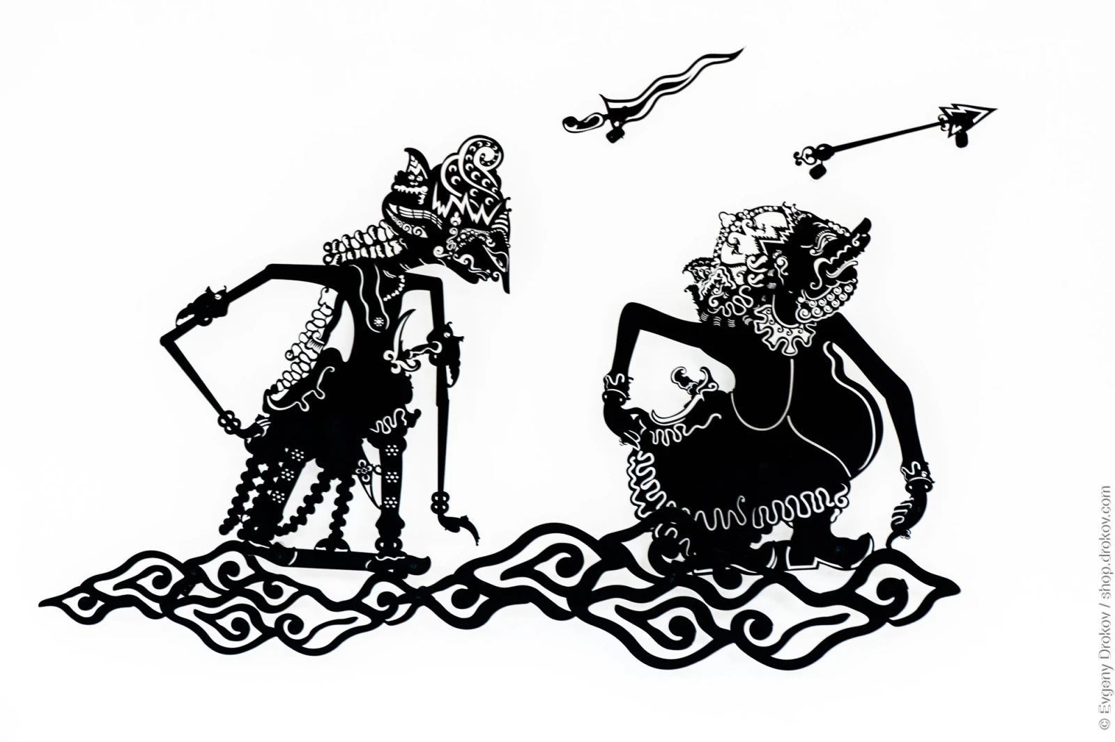 Yogyakarta, Indonesia, January 2016. Two Wayang Kulit shadow puppets, representing characters from Javanese folklore, are presented in a dynamic composition. The intricate black cutouts, set against a stark white background, evoke the traditional art form and its storytelling heritage.
