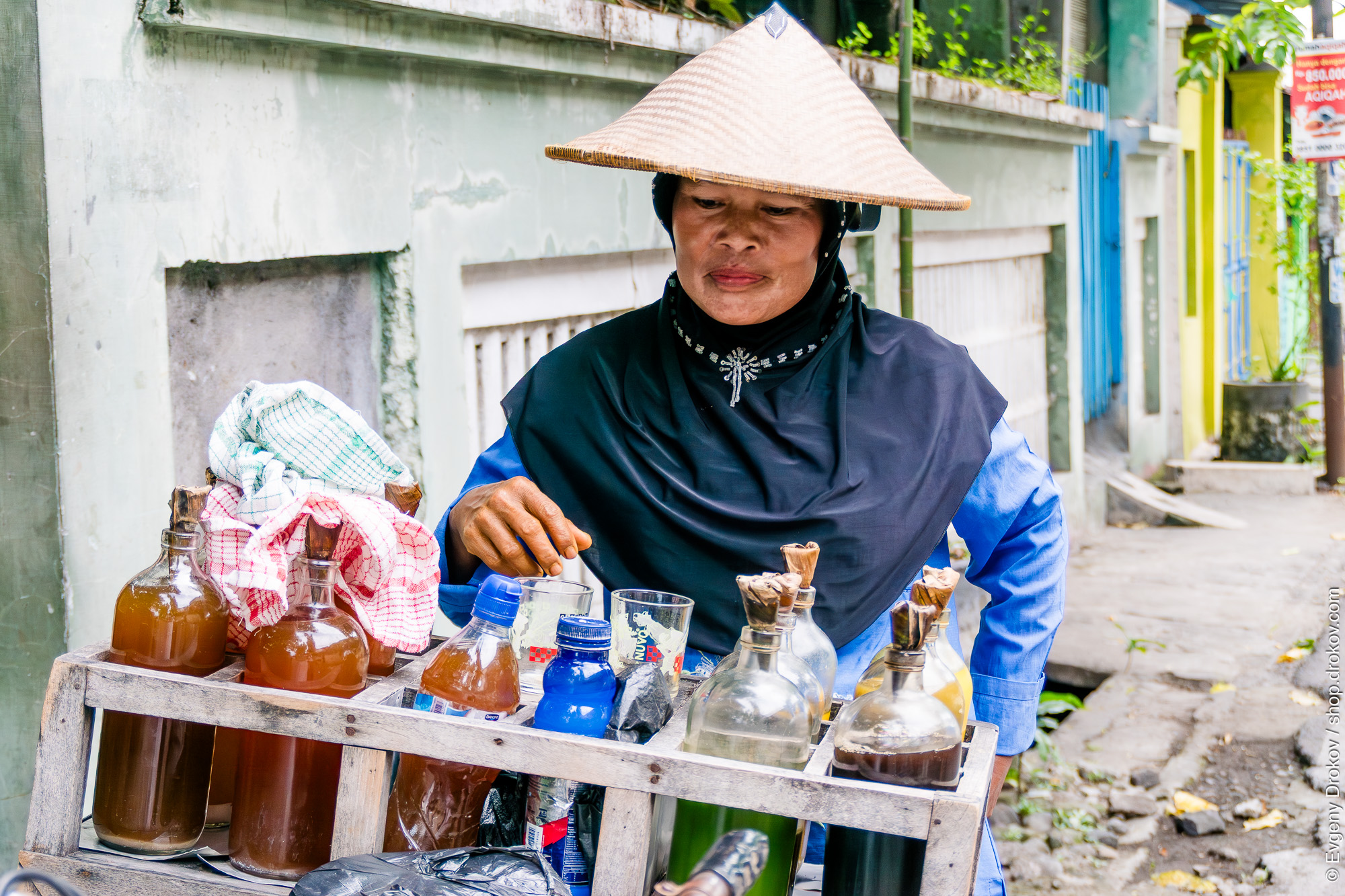 An Indonesian woman in Yogyakarta, Central Java, Indonesia, prepares to serve drinks from her cart in January 2016. She wears a traditional conical hat and headscarf, a common sight for street vendors in the region. Her cart displays various bottles filled with liquids, ready for sale to passersby.