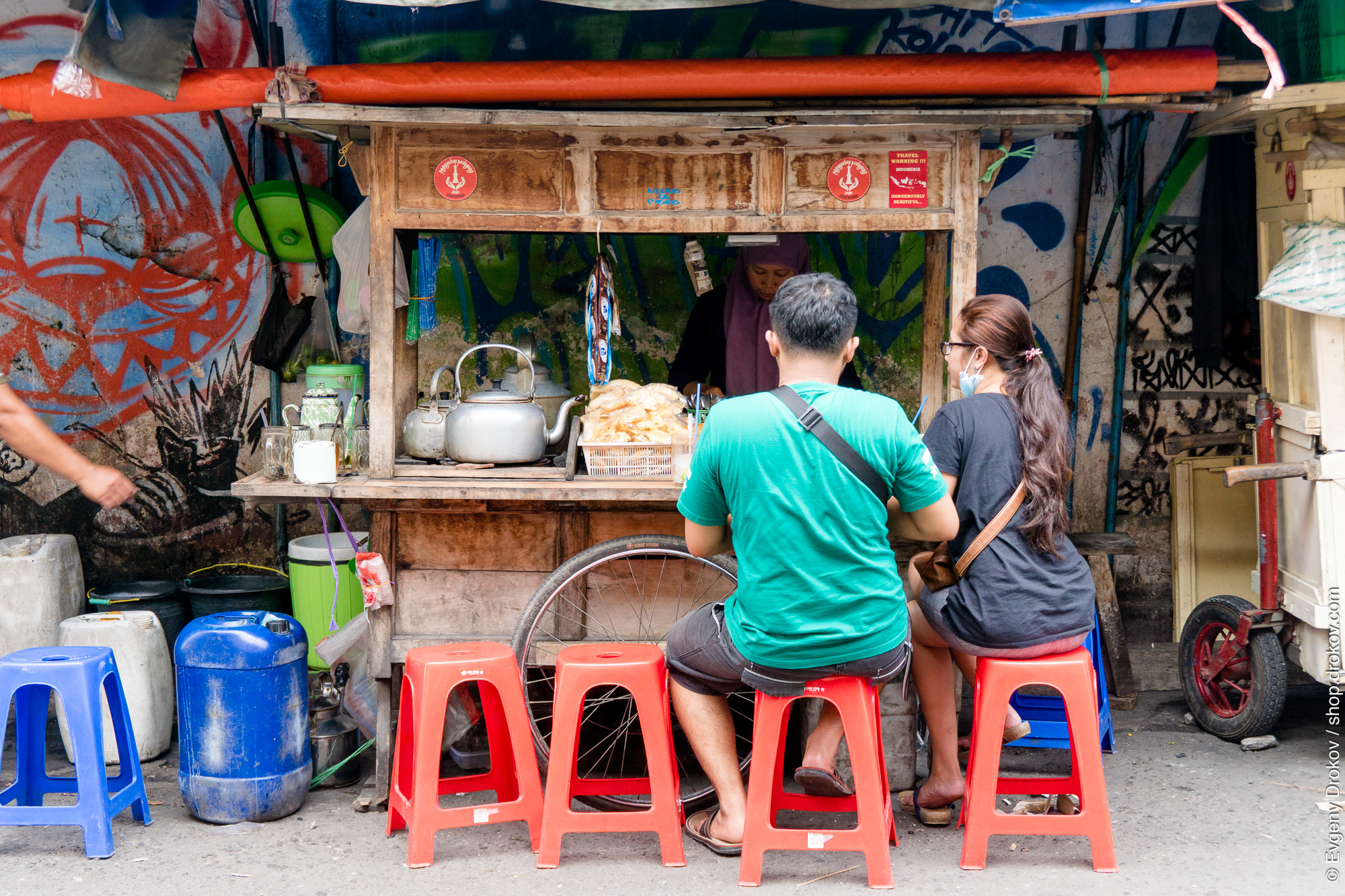 In Yogyakarta, Indonesia, January 2016, a couple enjoys a meal at a street food stall. The vibrant atmosphere and local cuisine offer a glimpse into everyday life.