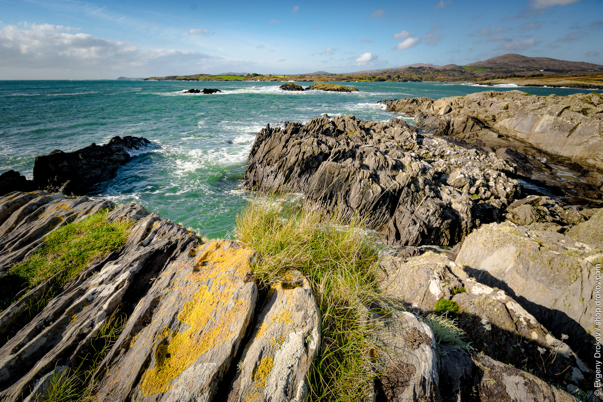 Coastal rocks, waves, and green grass