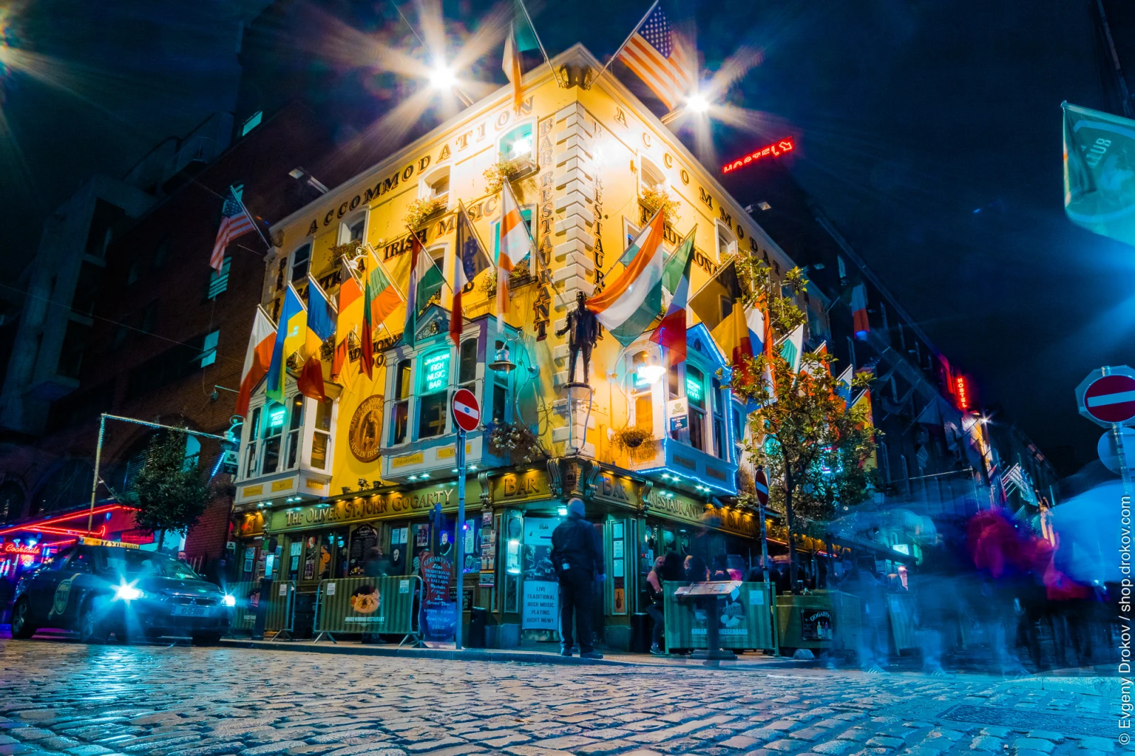 The Oliver St. John Gogarty, a vibrant bar and restaurant in Ireland, is captured at night during autumn. The establishment, adorned with numerous flags, showcases its lively atmosphere and commitment to traditional Irish music and culture.