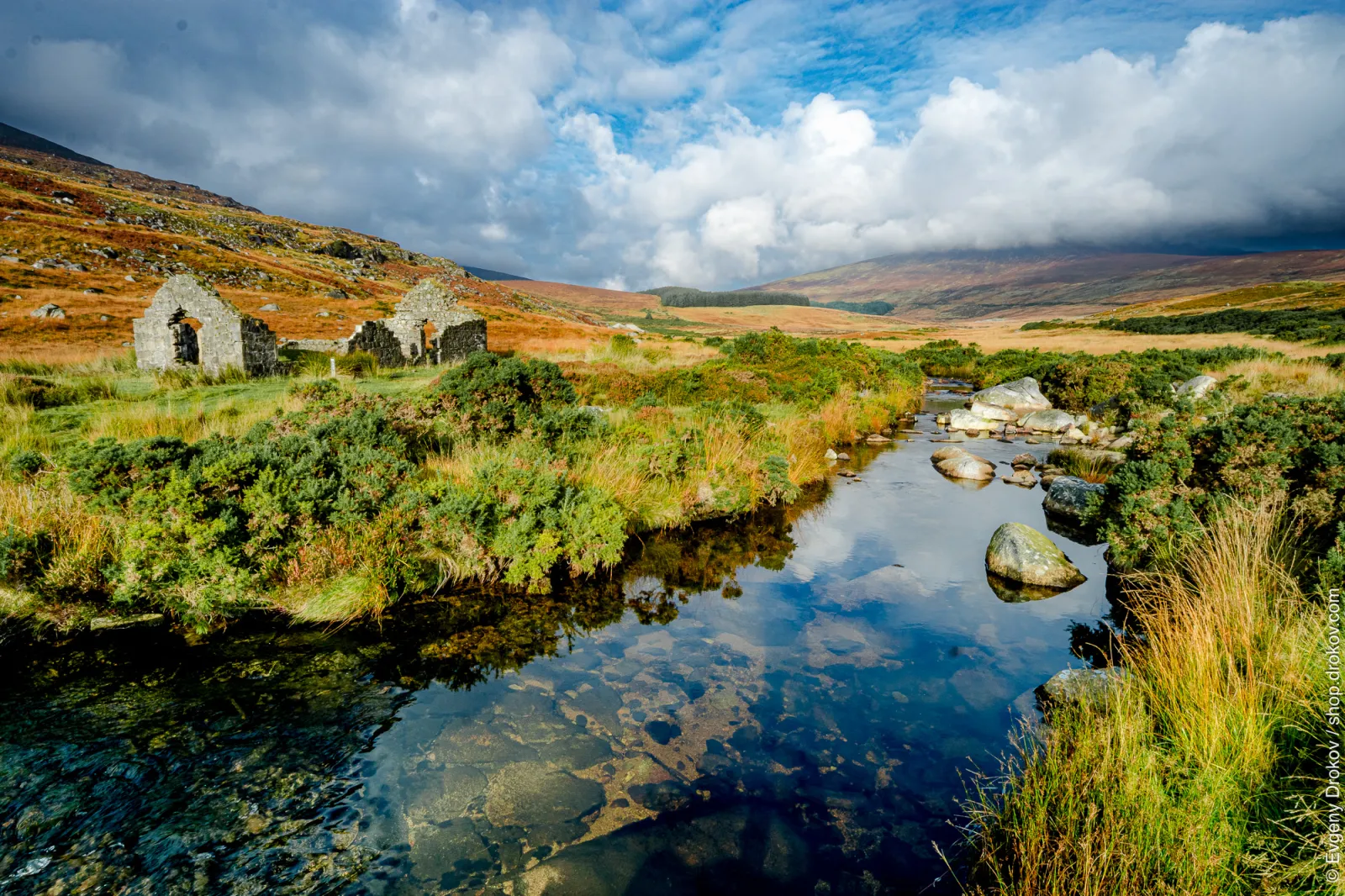 A tranquil mountain stream winds through a landscape of autumnal hues. Ruined stone structures stand as silent witnesses to the passage of time. The crystal-clear water reflects the vibrant sky and surrounding foliage. This image evokes a sense of peace and history.