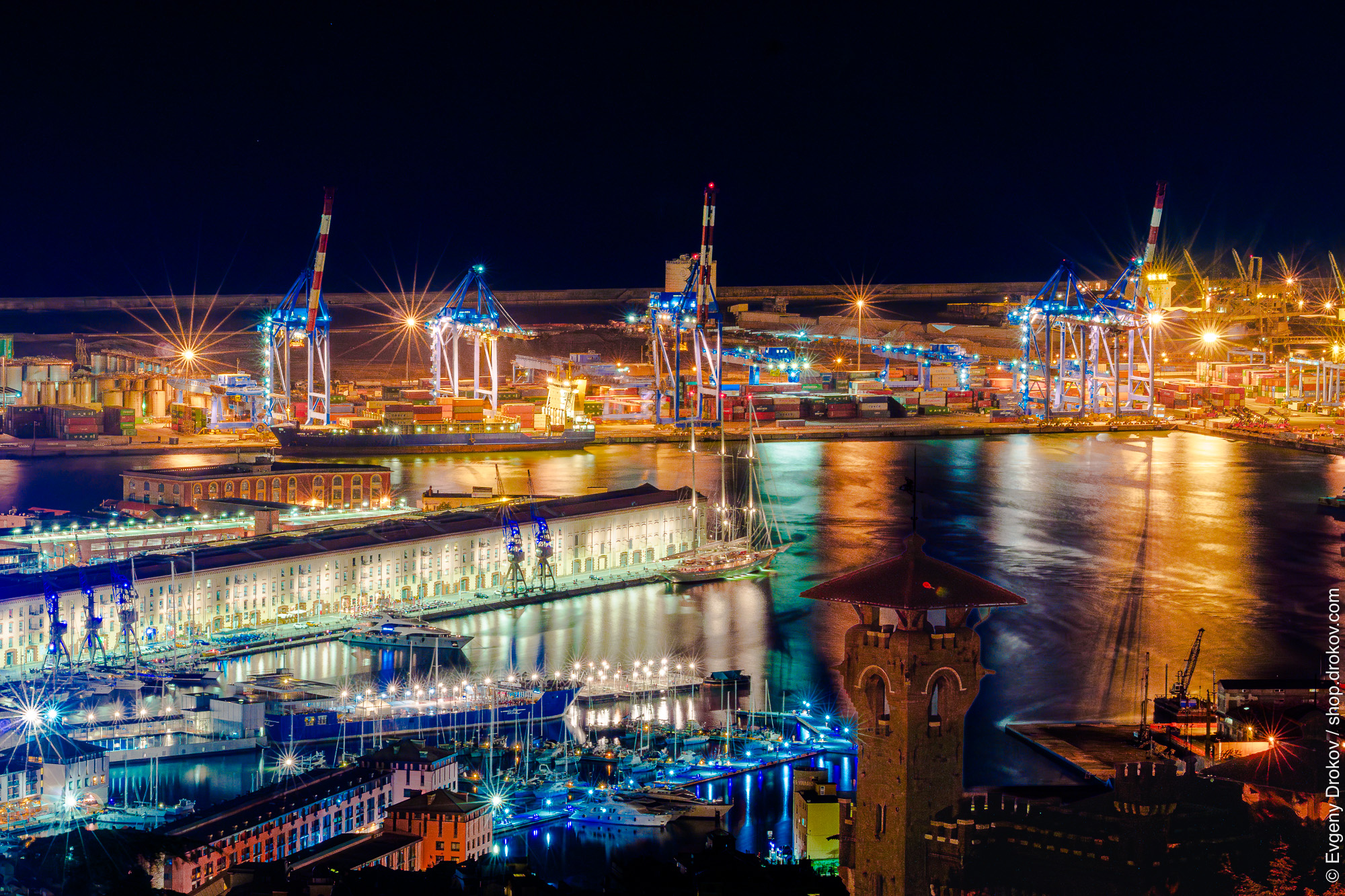 This is an aerial view of the Genoa port and marina at night. The illuminated cranes and cargo ships showcase the bustling maritime activity of this vital Italian hub.