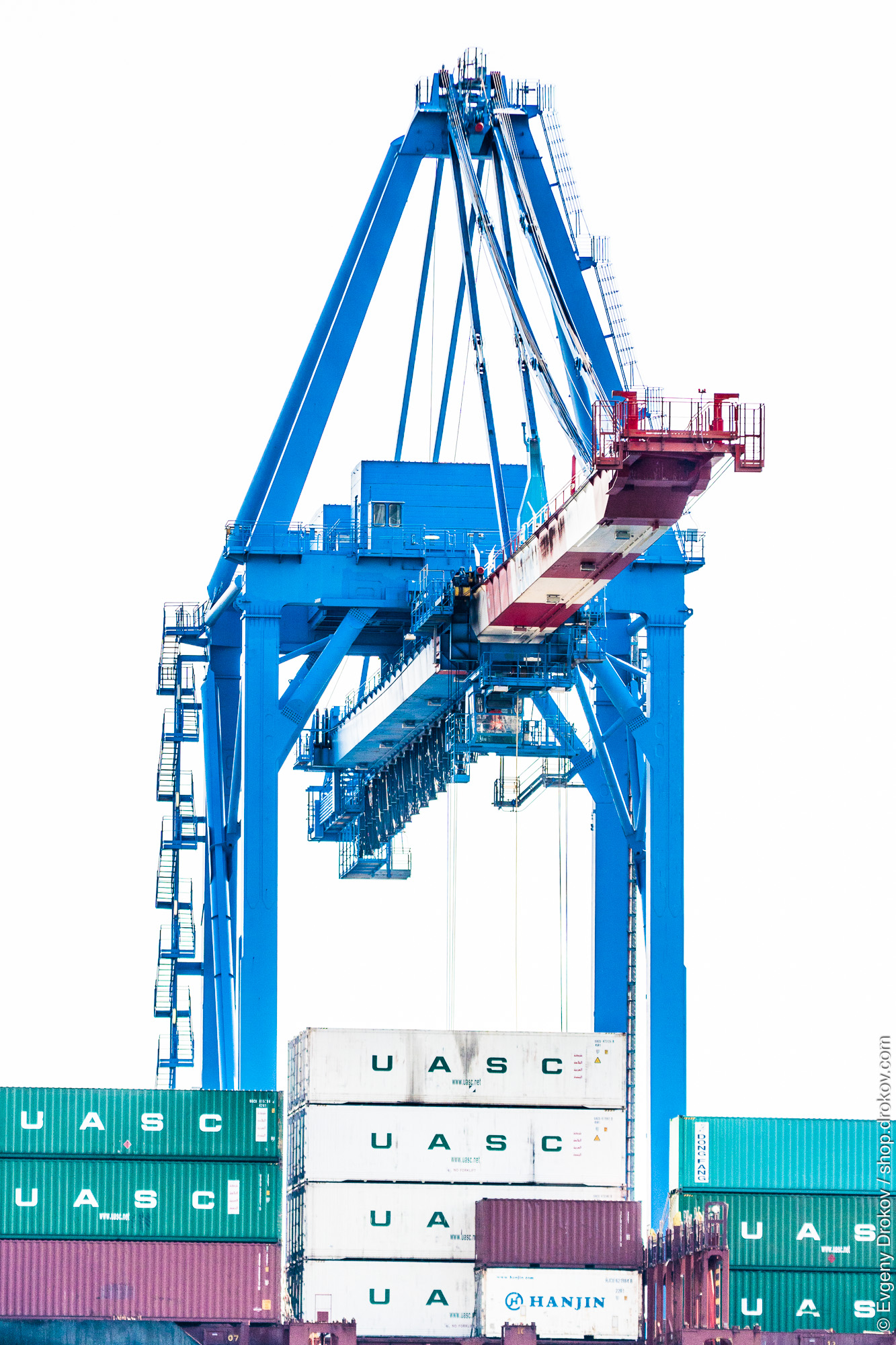 A massive blue gantry crane stands ready at the Port of Genoa, Italy, in August 2015. This powerful machinery is essential for the efficient loading and unloading of shipping containers, facilitating global trade and commerce.