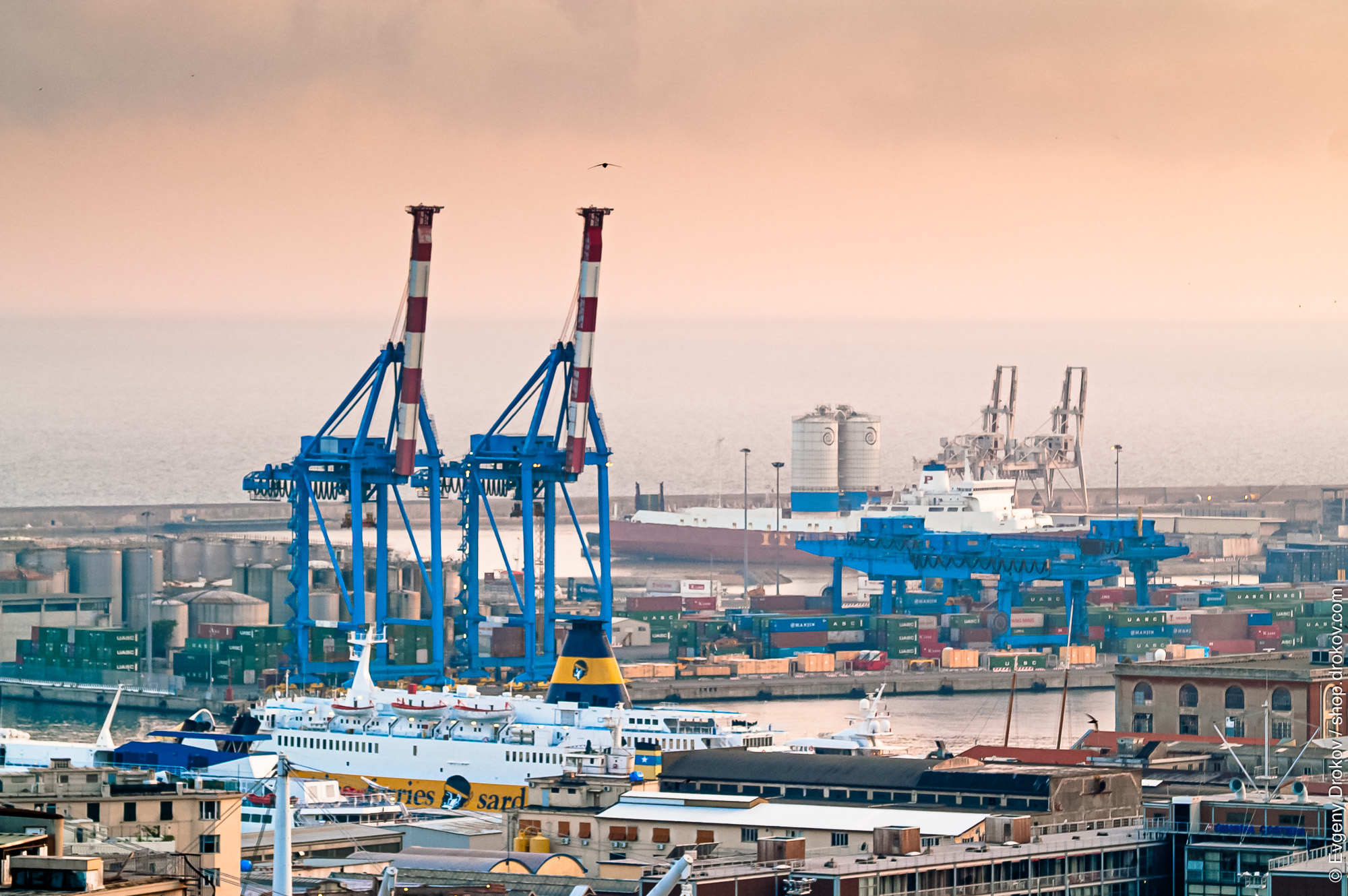 A ferry, identified by its "Sardinia" livery, is docked at a bustling port. Towering cranes stand ready to load and unload cargo containers, facilitating global trade. The scene captures the vital operations of maritime logistics.