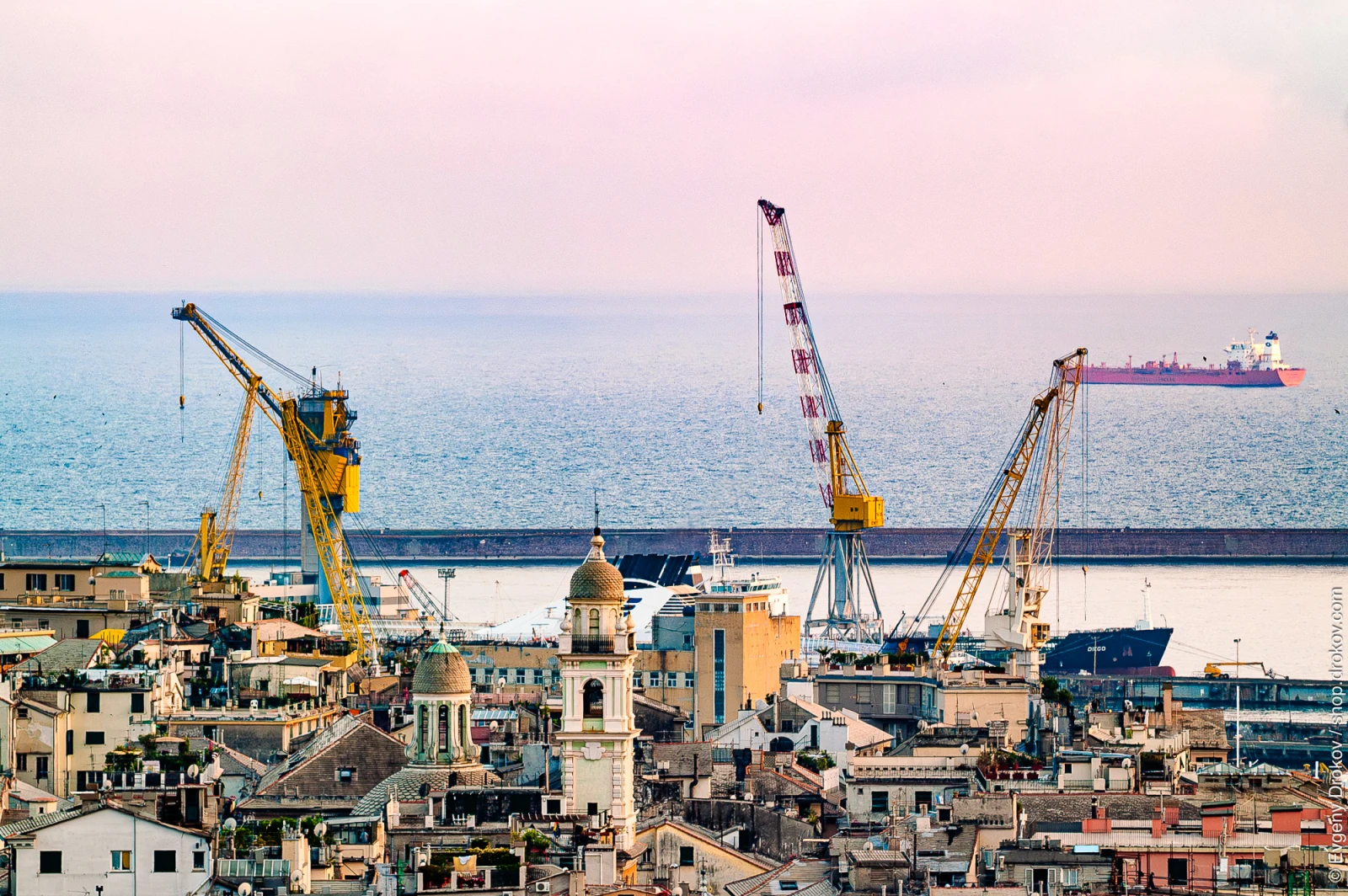 Genoa, Italy. This view captures the dynamic energy of a historic port city. Industrial cranes actively load and unload cargo, a testament to the vital role this hub plays in global trade. A large cargo ship on the horizon underscores the port's significance in maritime commerce.