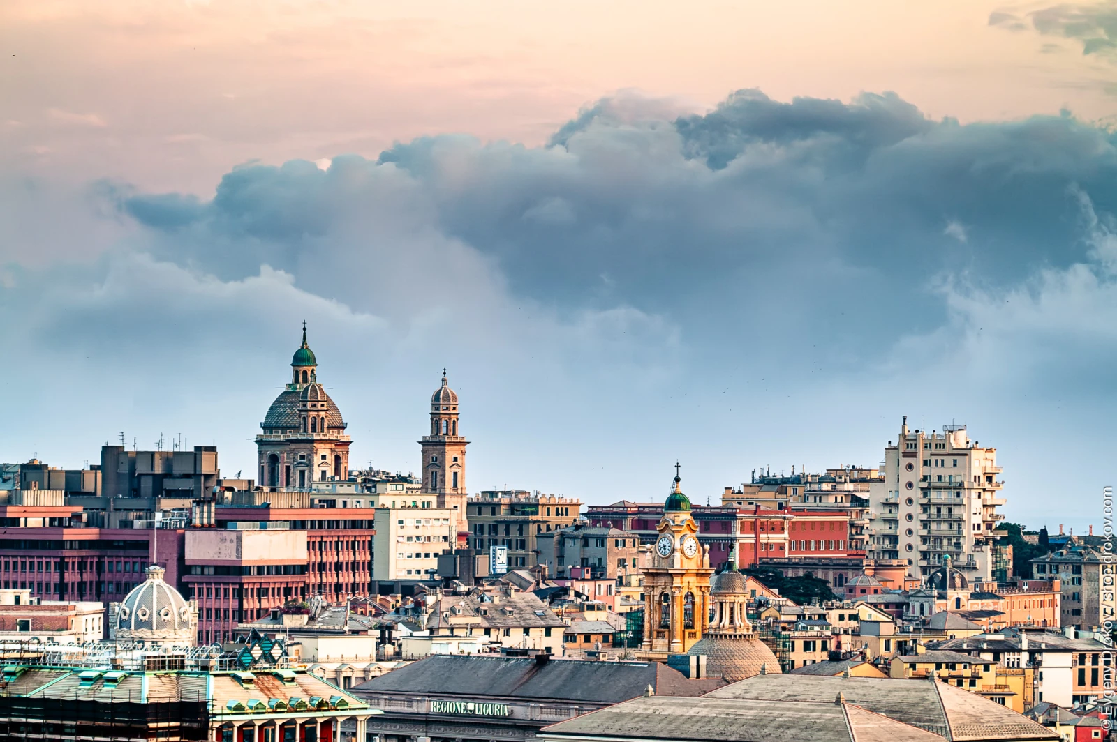 Genoa, Italy, in May, presents a captivating urban panorama. The city's distinctive architecture, a blend of historic domes and modern structures, is bathed in the soft light of dawn or dusk, creating a dramatic and evocative atmosphere. This view captures the essence of Genoa's enduring beauty.