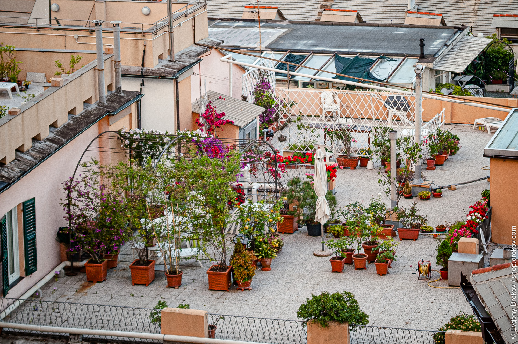 This is a vibrant rooftop garden, meticulously curated with a diverse array of potted plants and blooming flowers. The lush greenery and colorful blossoms create a serene oasis, offering a peaceful escape amidst the urban landscape.