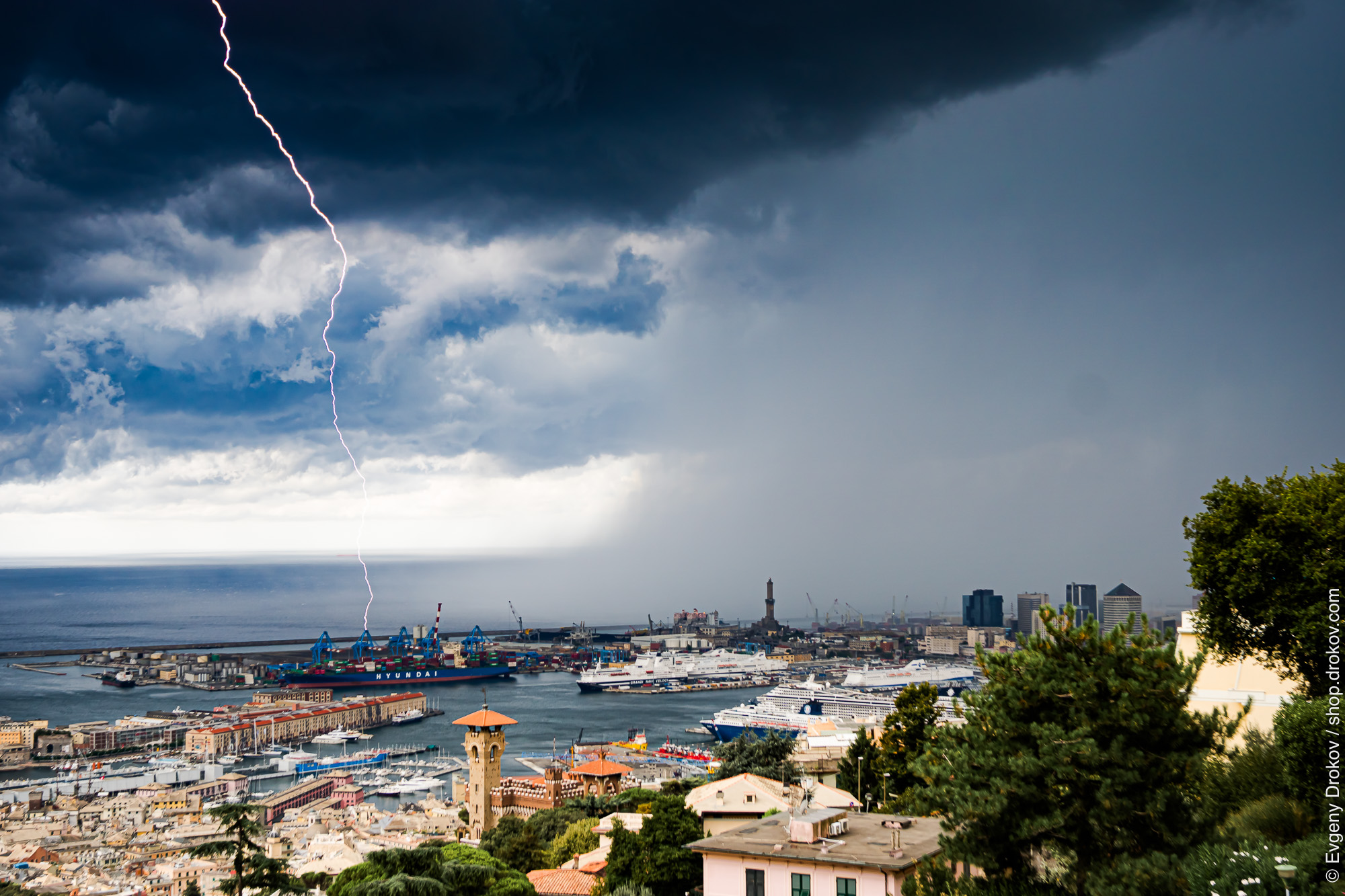 A dramatic lightning strike illuminates a bustling port city harbor during a severe thunderstorm. The powerful electrical discharge highlights the intensity of the weather event, contrasting with the calm waters and docked ships. The image showcases the resilience of urban infrastructure amidst a natural phenomenon.