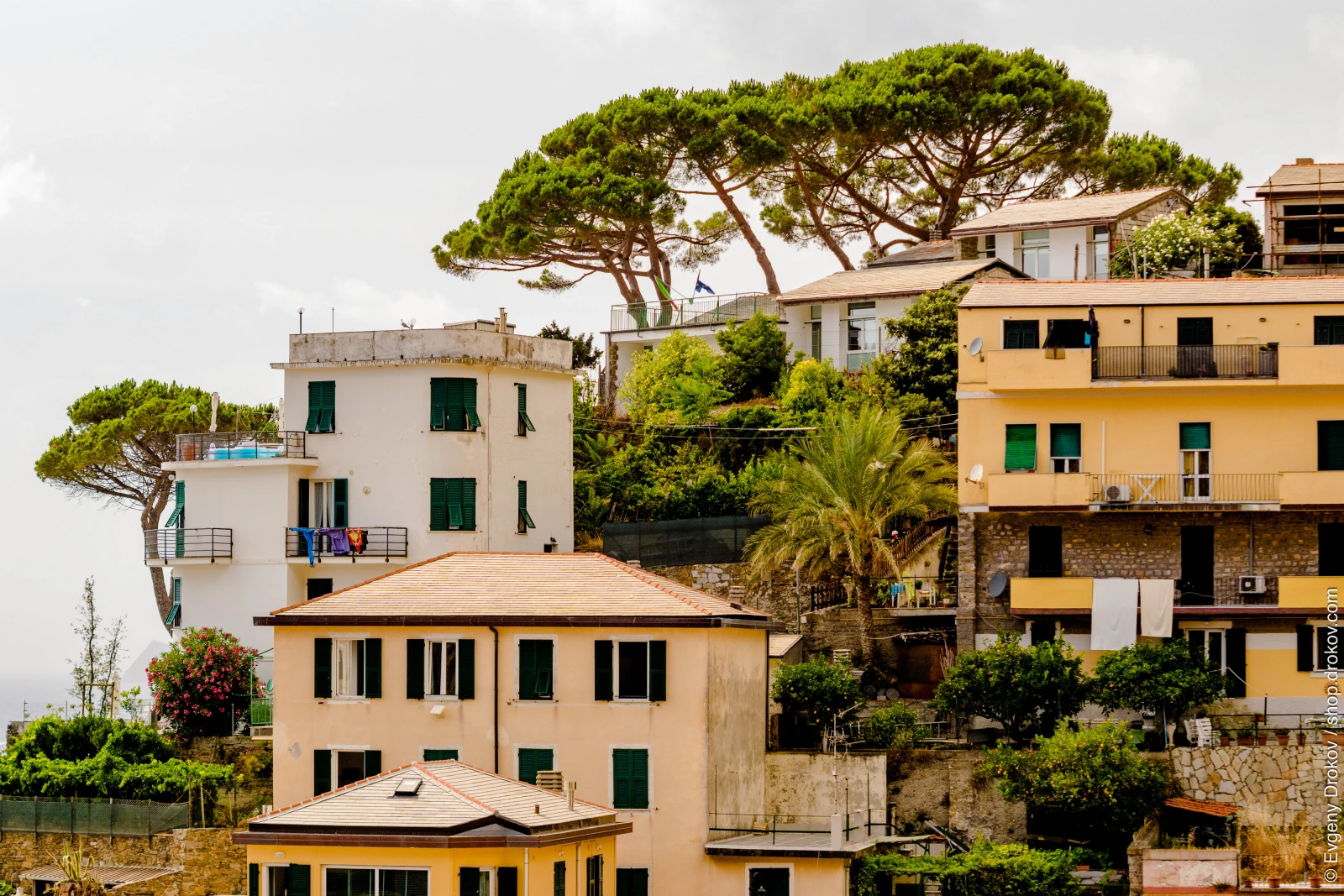 Buildings cascade down the hillside in Manarola, Italy, showcasing the charming architecture of this Cinque Terre village. The vibrant colors and lush greenery capture the essence of coastal Italian life.