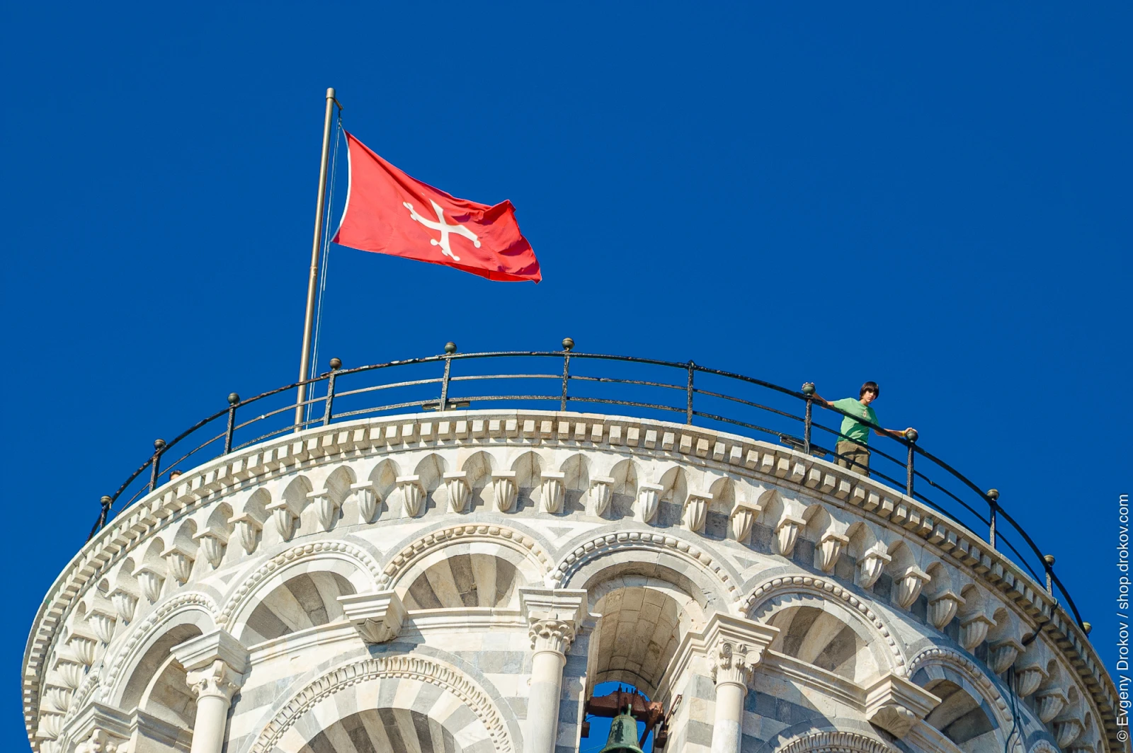 A young man stands on the observation deck of the Leaning Tower of Pisa, Tuscany, Italy, enjoying the panoramic view. The iconic red flag with a white cross flies proudly against the clear blue sky.
