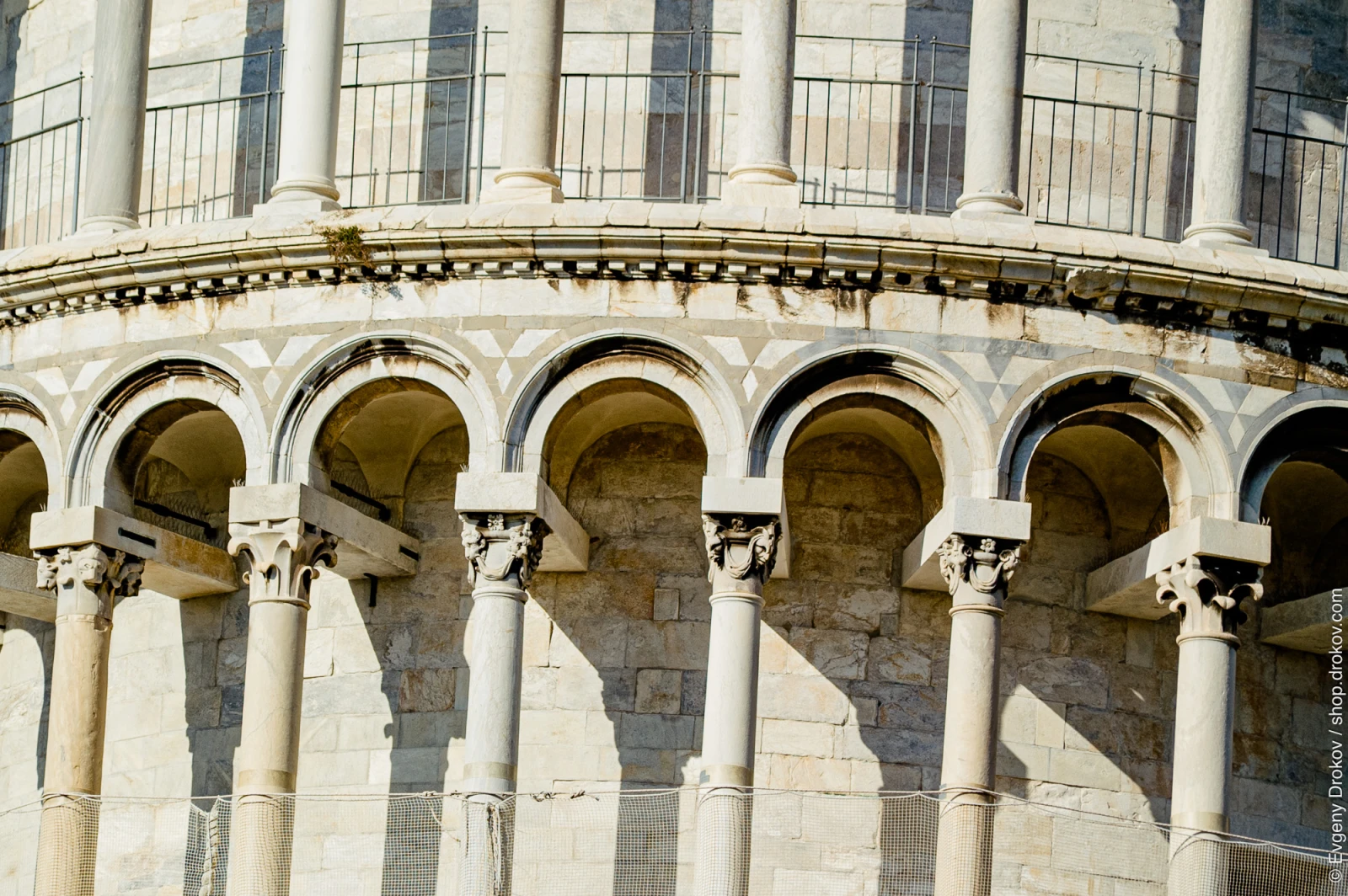 This is a close-up of the architectural details of the Pisa Cathedral in Pisa, Italy. The ornate columns and arches showcase the Romanesque style, highlighting the enduring beauty and historical significance of this iconic landmark.
