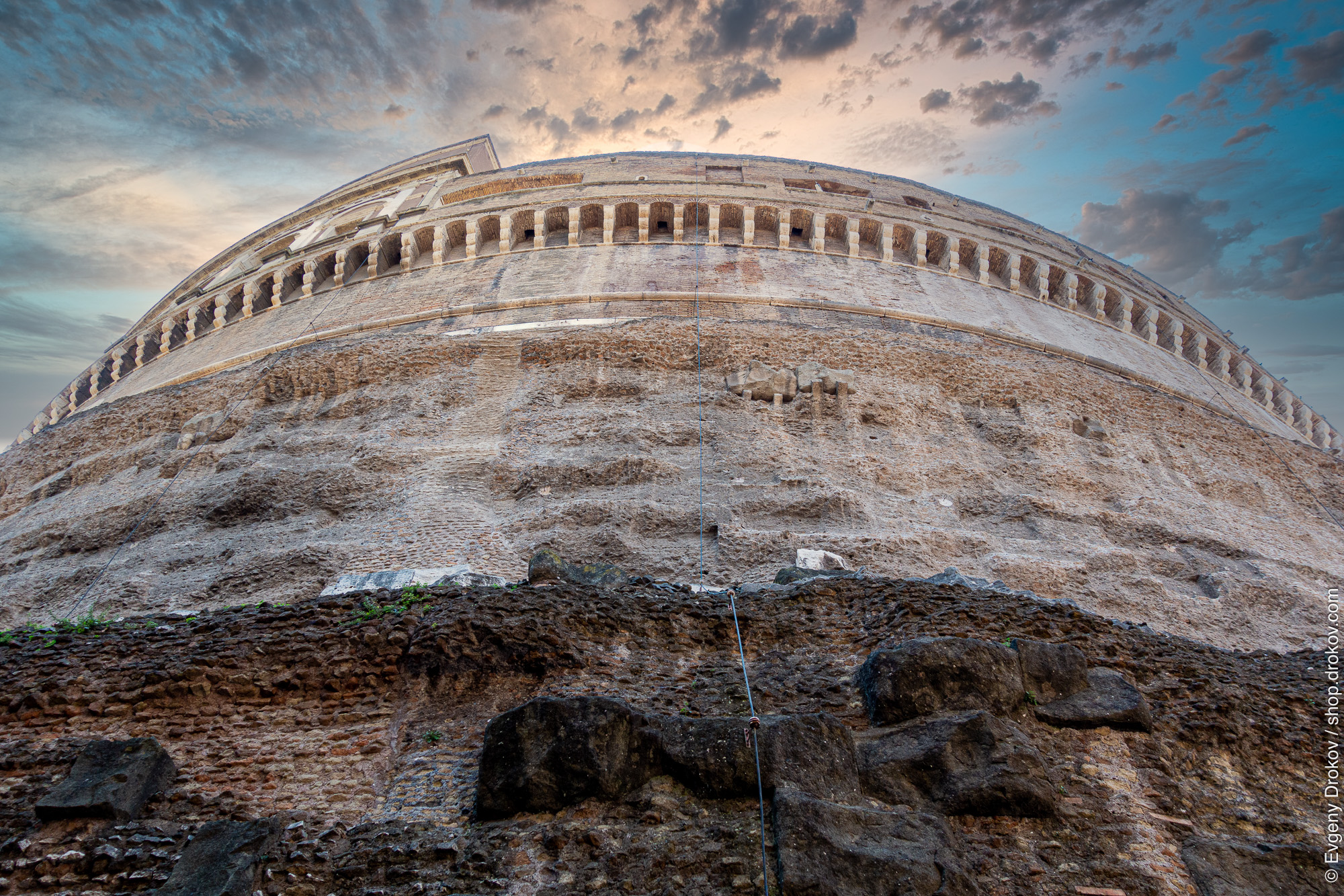 The Mausoleum of Augustus in Rome showcases its ancient Roman layered stonework. A support cable is affixed to the structure, indicating ongoing preservation efforts for this historical monument.