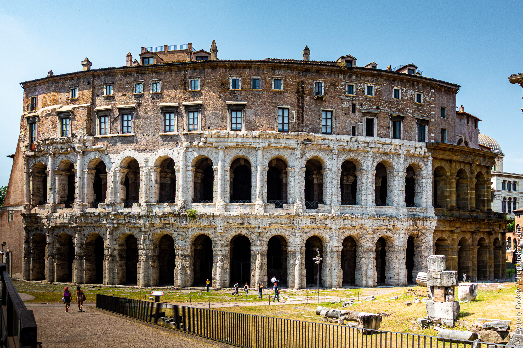 In Rome, 2021, a rare moment of tranquility unfolds at the Theatre of Marcellus. With minimal visitors, the ancient structure stands in quiet grandeur, showcasing its enduring architectural beauty against a clear blue sky. This capture highlights the historical significance of the site, unburdened by the usual crowds.