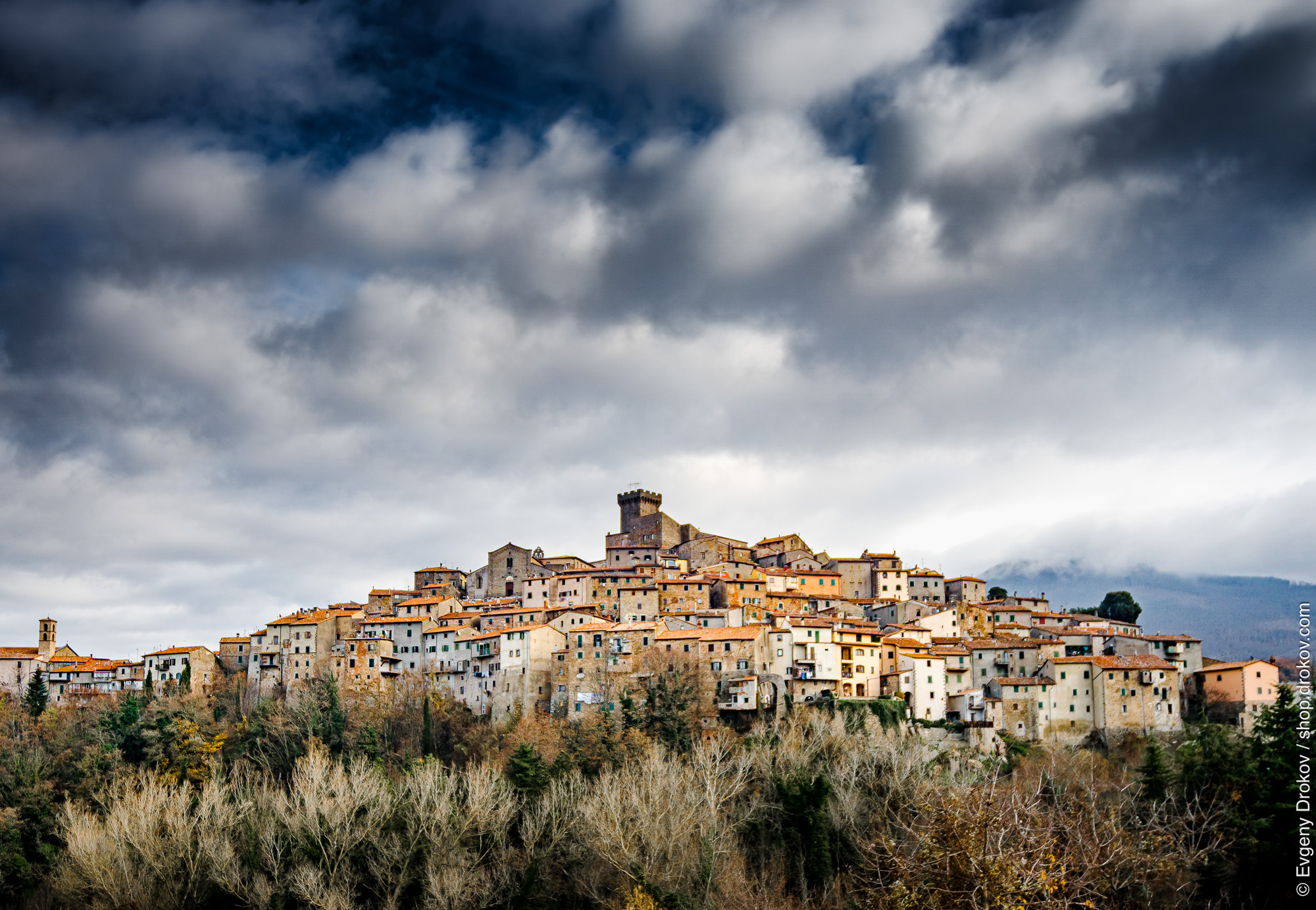 A dramatic December sky looms over the historic hilltop town of Arcidosso, Tuscany, Italy. This composition captures the enduring architecture and rugged beauty of the region, showcasing its timeless appeal.