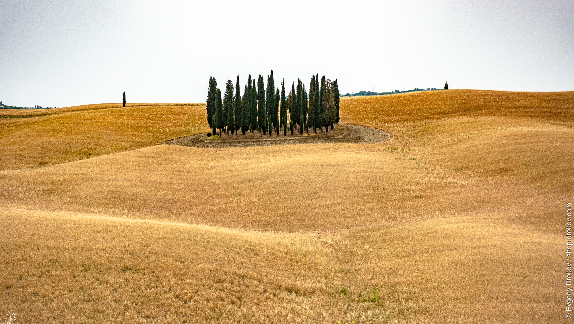 This striking composition captures the iconic cypress trees of San Quirico d'Orcia, Tuscany, during a golden summer. The rolling hills, bathed in warm light, showcase the region's quintessential agricultural landscape. This artwork evokes the timeless beauty and serene atmosphere of the Tuscan countryside.