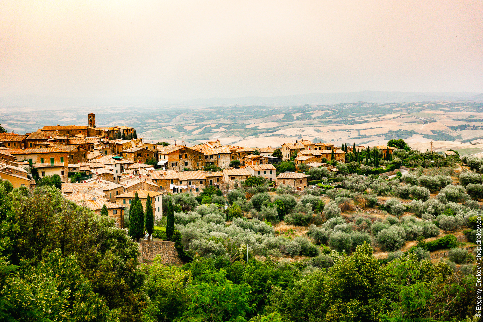 This is a panoramic view of Montalcino, Tuscany, Italy, captured during the summer. The composition showcases the historic hilltop town nestled amidst rolling hills and lush olive groves, evoking the timeless beauty and serene atmosphere of the Tuscan countryside.