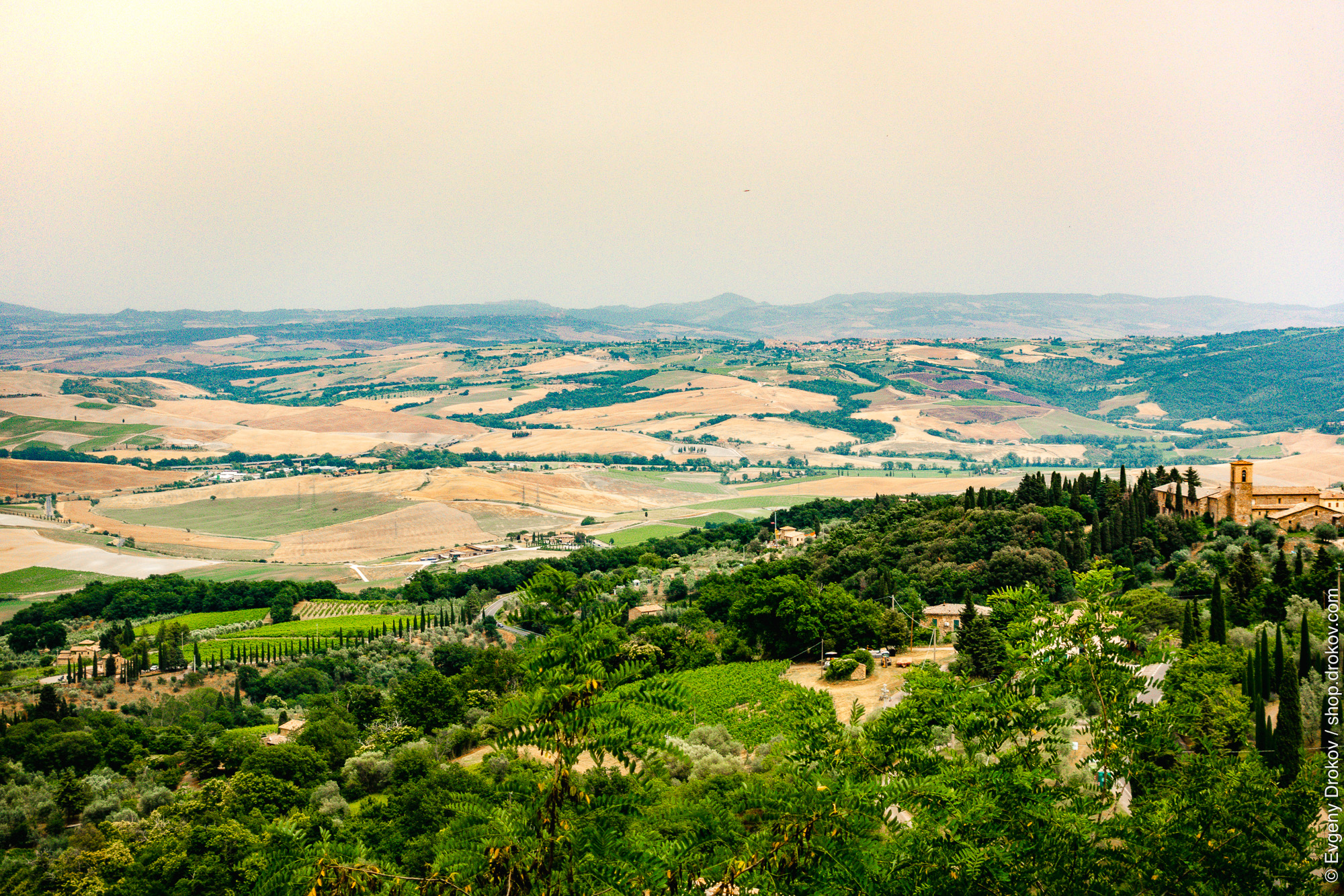 This expansive vista captures the essence of Tuscany in summer. Rolling hills, cultivated fields, and cypress-lined avenues showcase the region's agricultural beauty and timeless architecture. The warm, hazy light emphasizes the serene atmosphere of this Italian landscape.