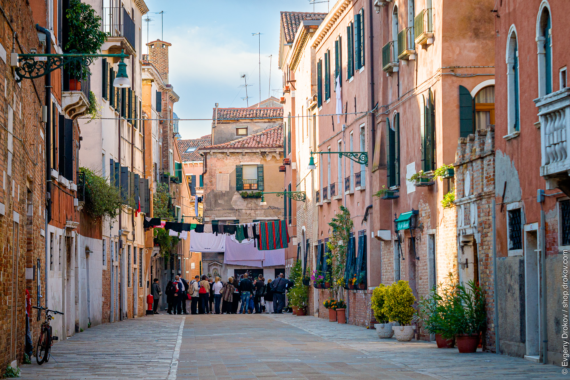 A group of people observe laundry drying in a narrow Venetian alleyway. This captures the essence of everyday life against the backdrop of historic architecture in Venice, Italy.