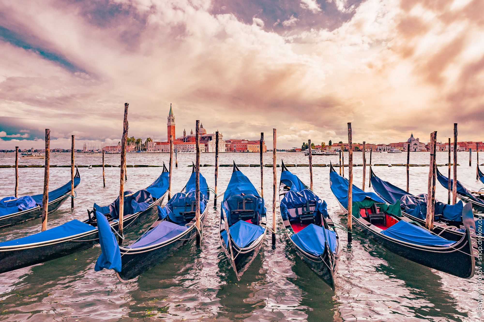 Venetian gondolas rest in the water, awaiting passengers. The iconic boats, a symbol of Venice, are docked in the canal under a dramatic October sky, ready to offer rides through the city's waterways.