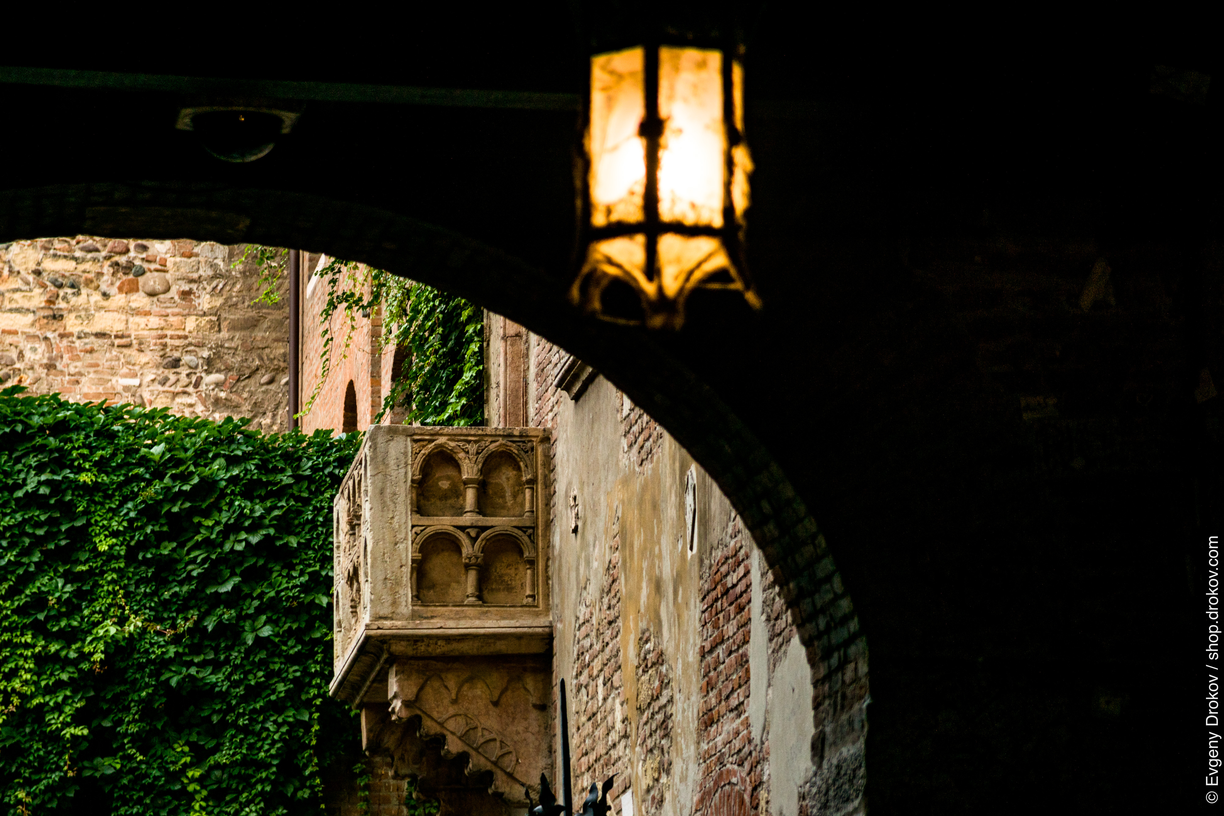 This is a view of an ancient balcony in Verona, Italy, framed by an archway and illuminated by a vintage lantern. The rich textures of brick and stone, softened by lush ivy, evoke a sense of timeless romance and historical depth.