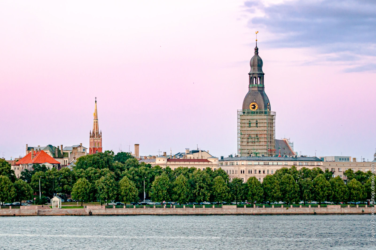 Riga's skyline is captured in August 2012, showcasing historic architecture against a soft twilight sky. The prominent clock tower, undergoing renovation, stands as a testament to the city's enduring heritage. This view highlights Riga's picturesque waterfront and its blend of old-world charm and ongoing development.