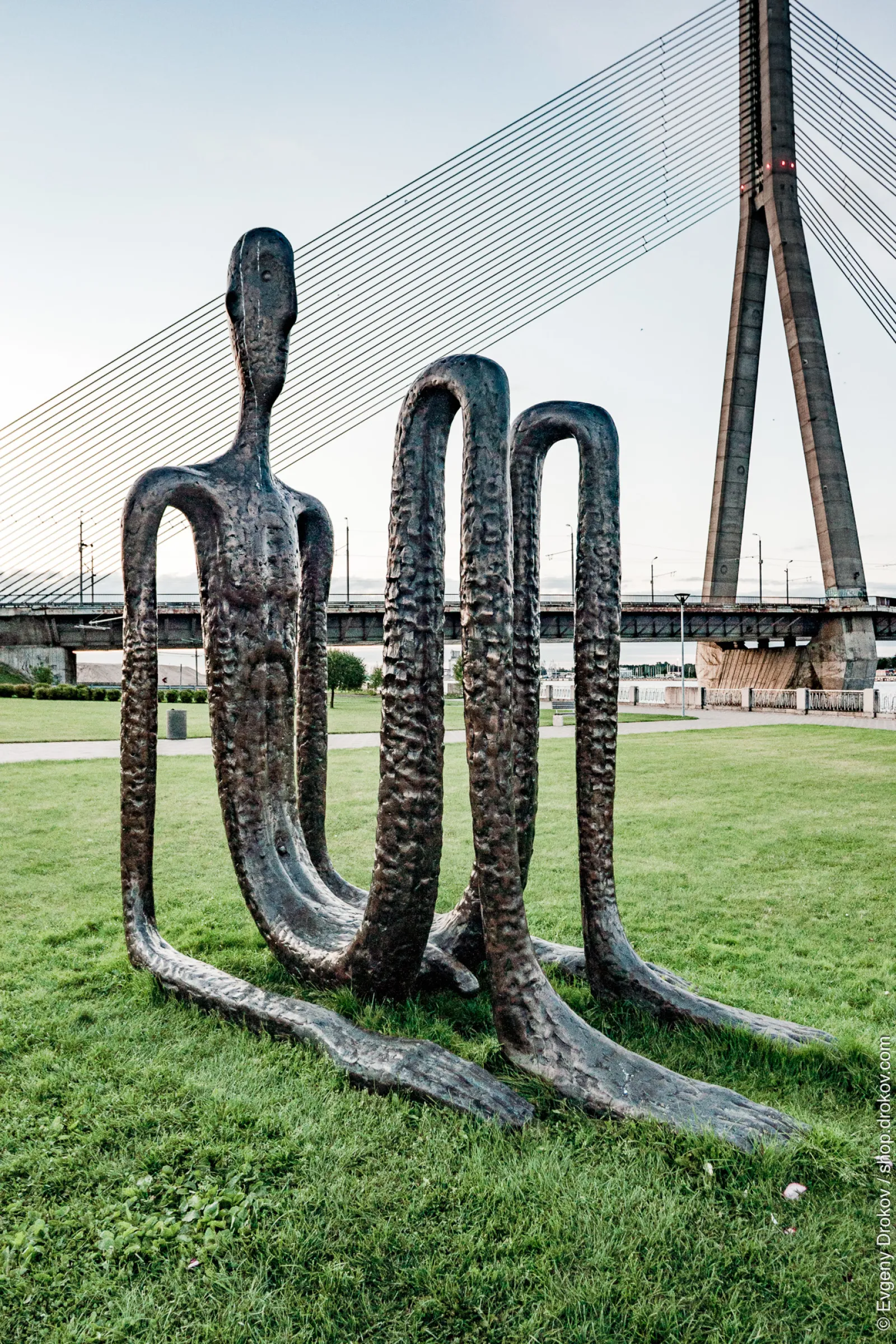 This striking sculpture, located in Riga, Latvia, captures the essence of human form and connection. Created in August 2012, it stands as a testament to artistic expression against the backdrop of the city's modern infrastructure.