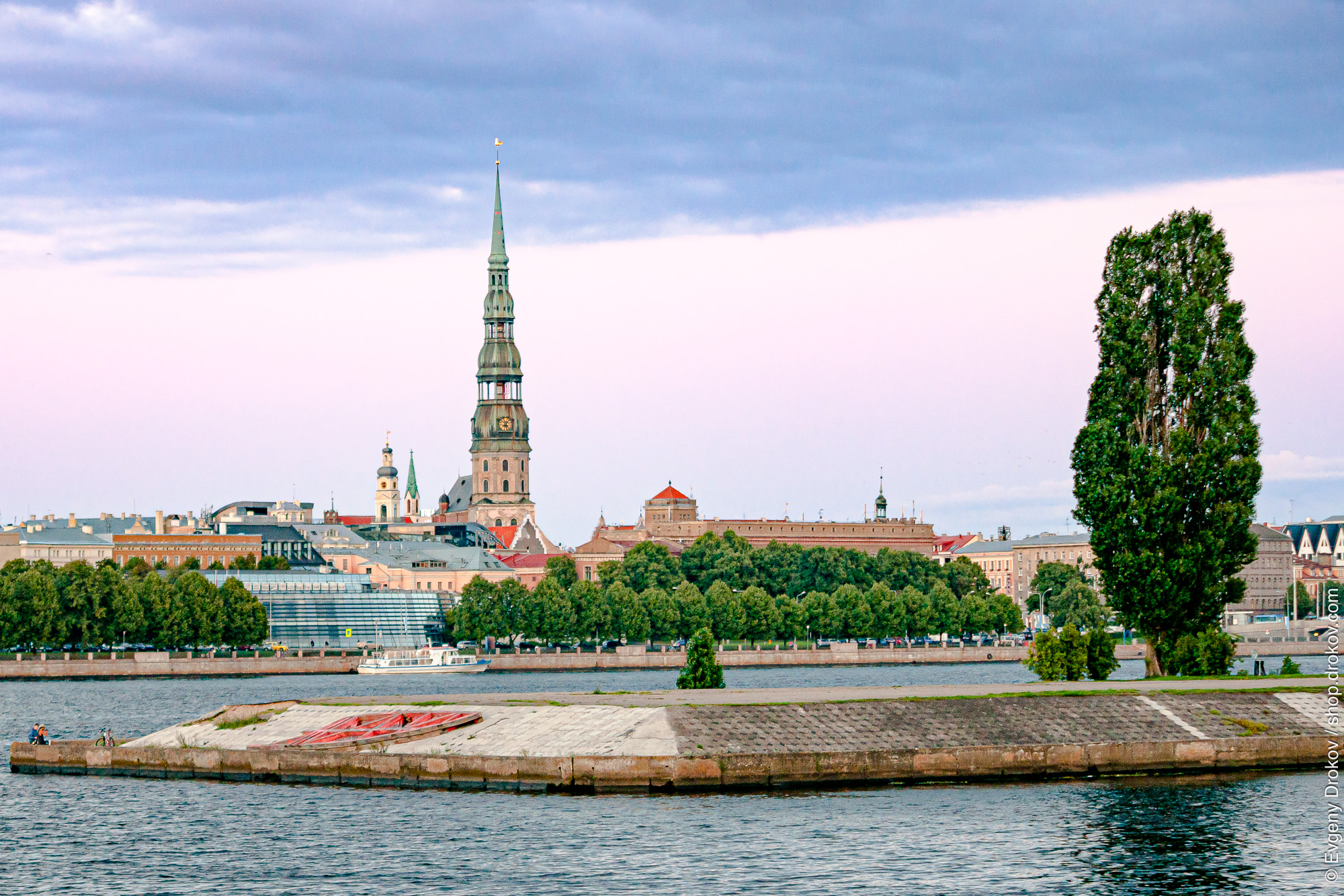 Riga, Latvia, August 2012. The iconic skyline of Riga is captured with St. Peter's Church spire dominating the view. This vista showcases the city's historic architecture against a soft, cloudy sky, offering a serene glimpse of the Latvian capital.