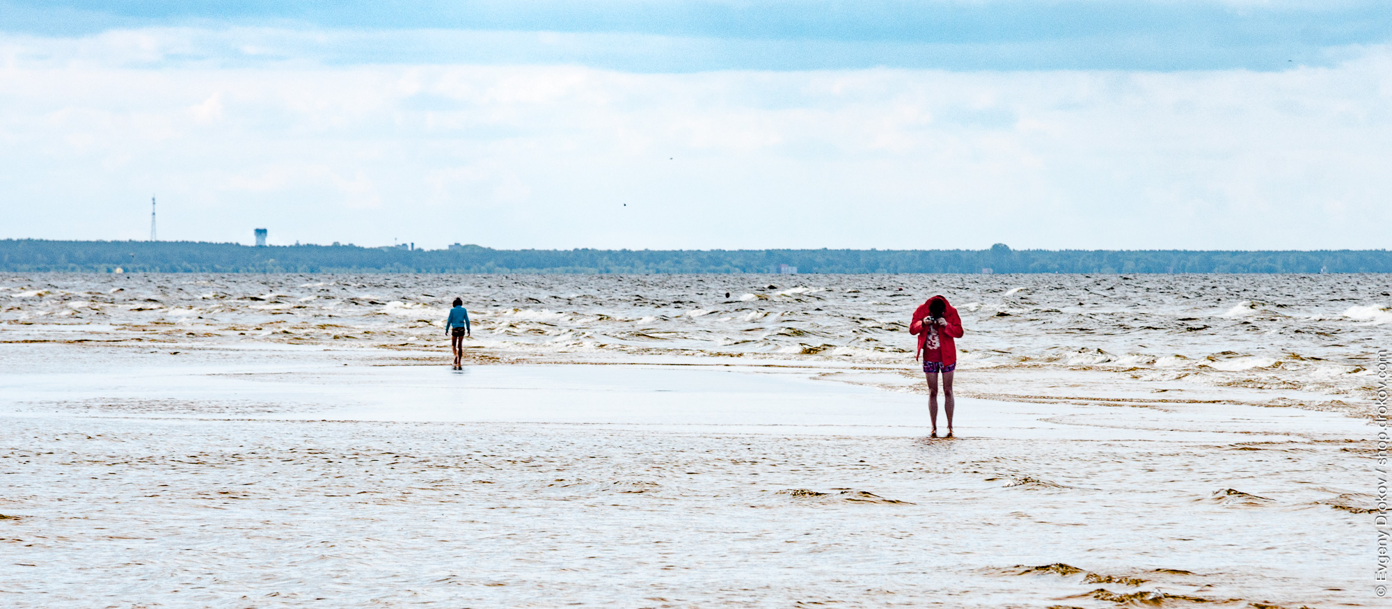 Two figures, one in blue and one in red, embrace the brisk coastal air on a Latvian shoreline. The choppy waters of Jurmala confirm a windy day, creating a dramatic backdrop for their exploration. This moment is captured to preserve the raw beauty of nature and human connection.