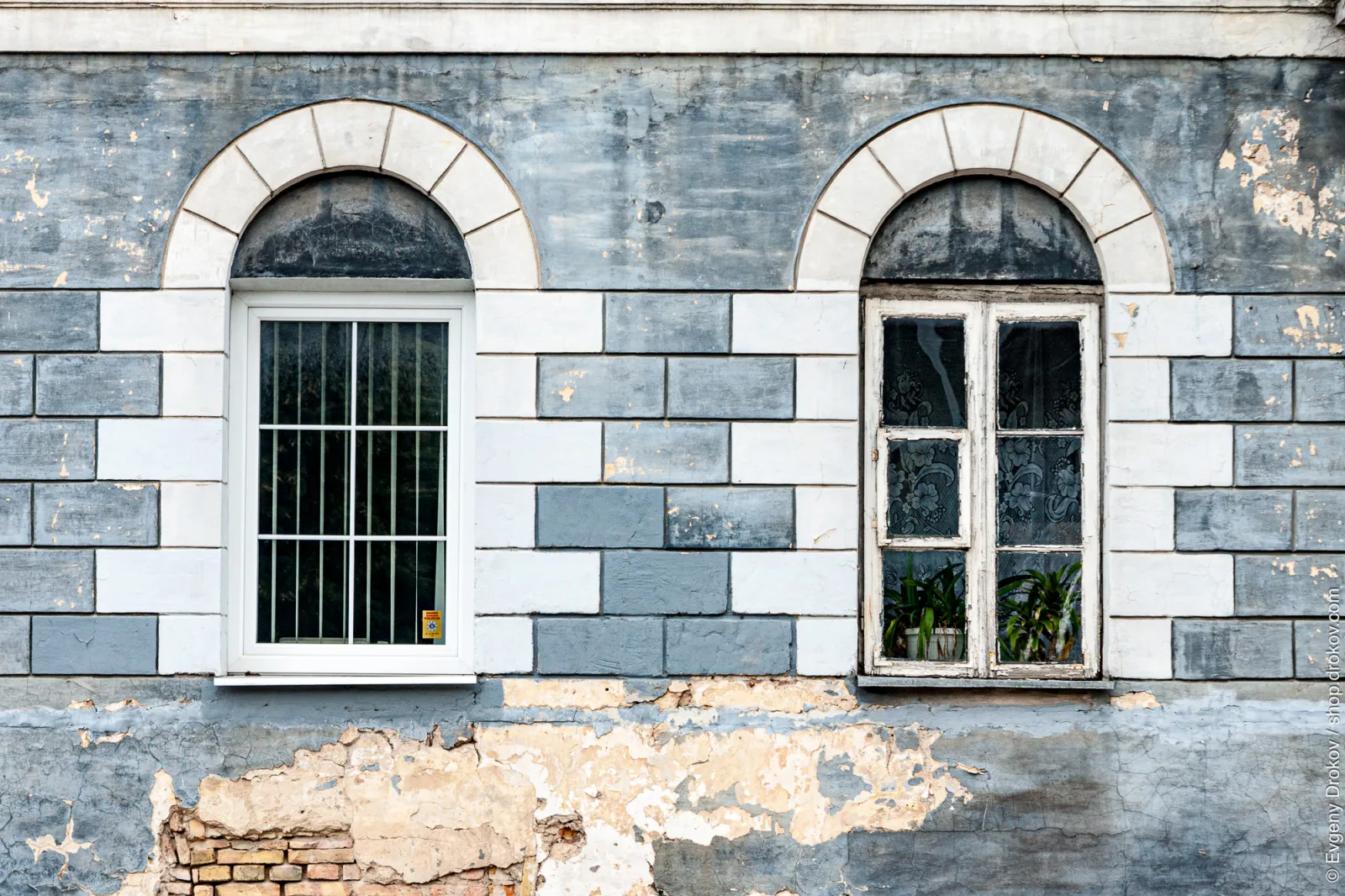 Two windows, one modern and one aged, are set into a weathered facade in Vilnius, Lithuania, August 2012. The contrast highlights the passage of time and the enduring nature of architecture.