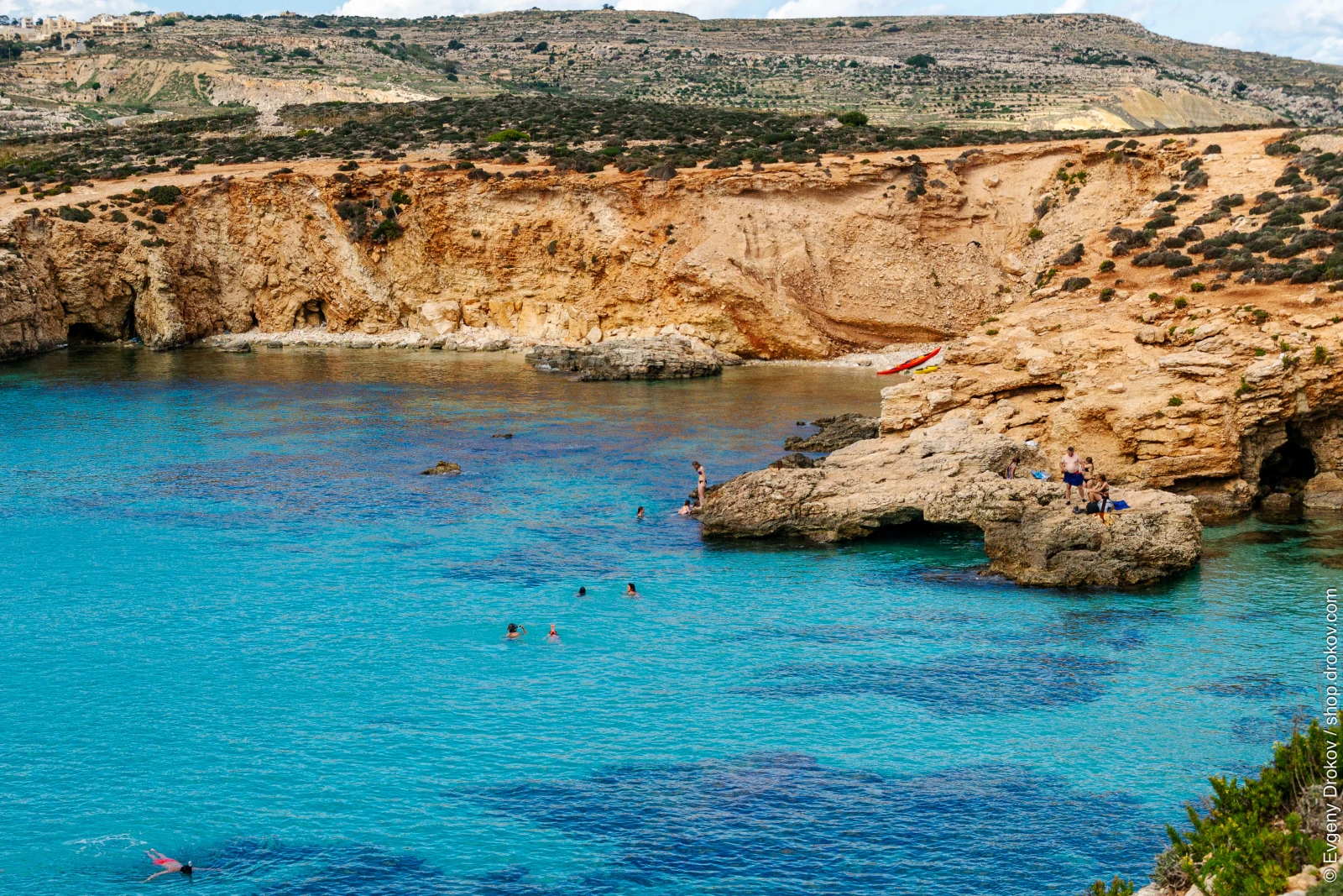 Tourists enjoy the crystal-clear waters and rugged coastline of Għajnsielem, Comino, Malta. They swim, sunbathe, and explore the natural beauty of this Mediterranean paradise.