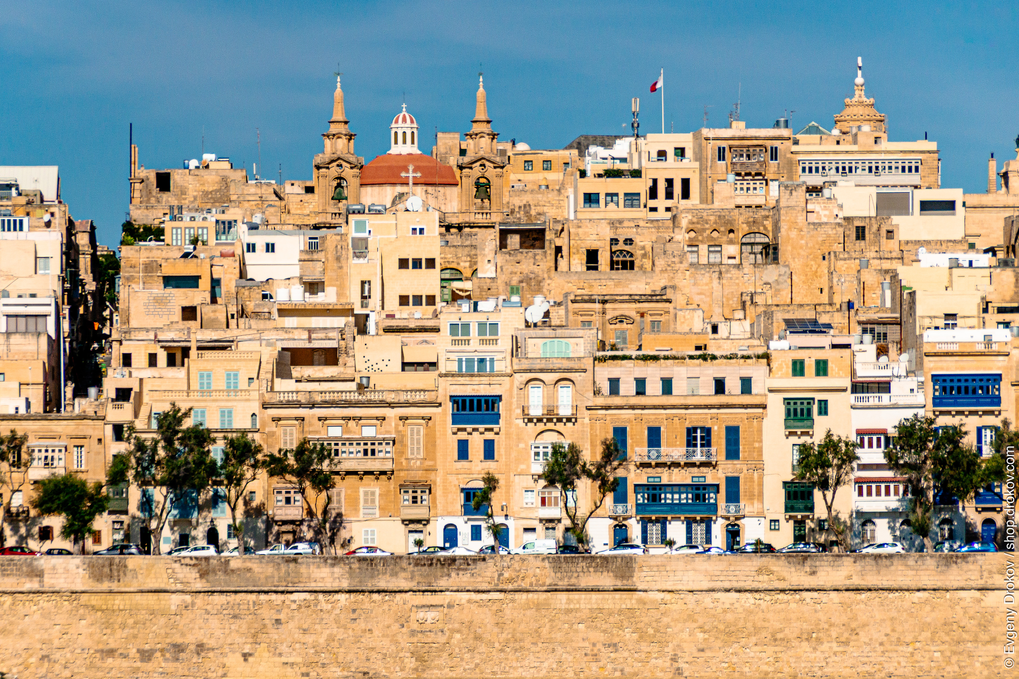 The historic cityscape of Valletta, Malta, is captured under a clear blue sky. This view showcases the distinctive architecture and vibrant urban life of the capital city, highlighting its rich heritage and enduring charm.