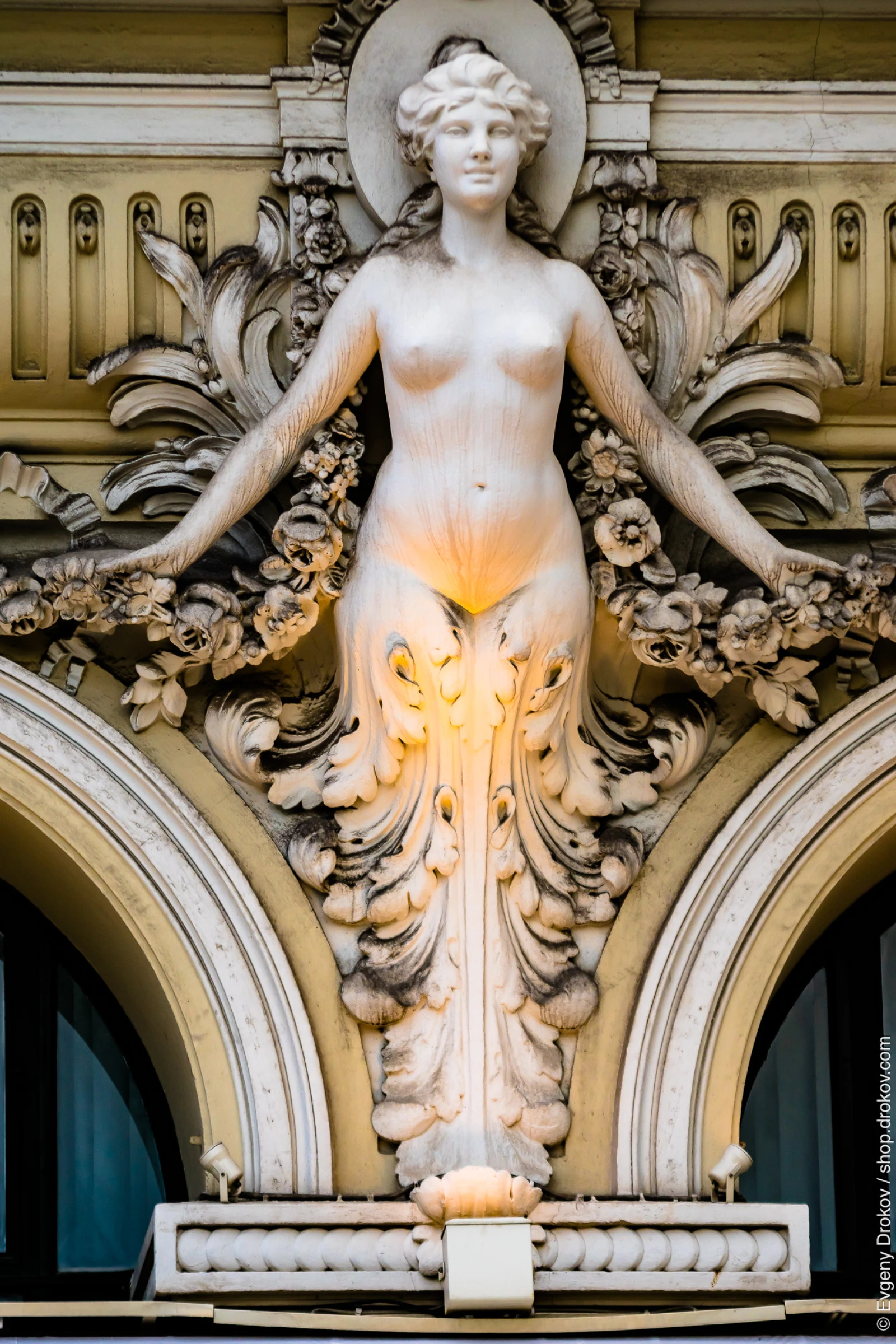 This is a detail of a classical architectural sculpture adorning a building in Monaco, captured in August 2015. The artwork, a female figure surrounded by floral motifs, exemplifies the ornate style of the era, highlighting the rich heritage of the principality.
