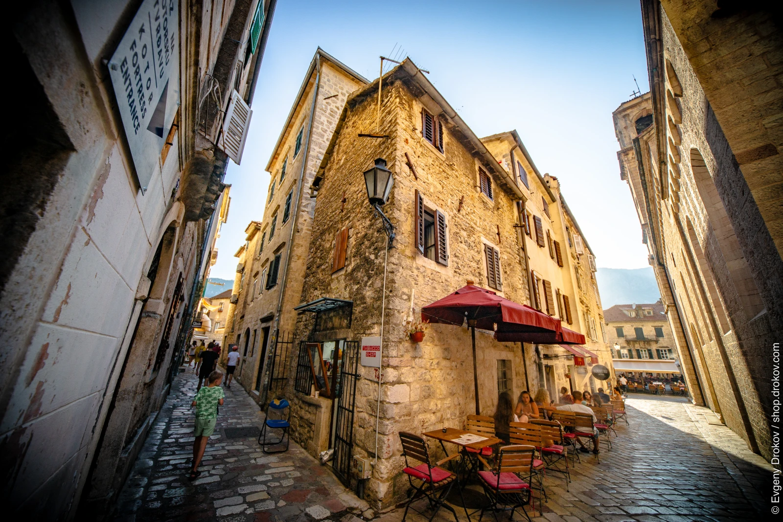 Pedestrians walk a narrow alleyway. Cafe tables and chairs are set up under a red awning. People are seated and enjoying the outdoor cafe. The alleyway is lined with stone buildings.