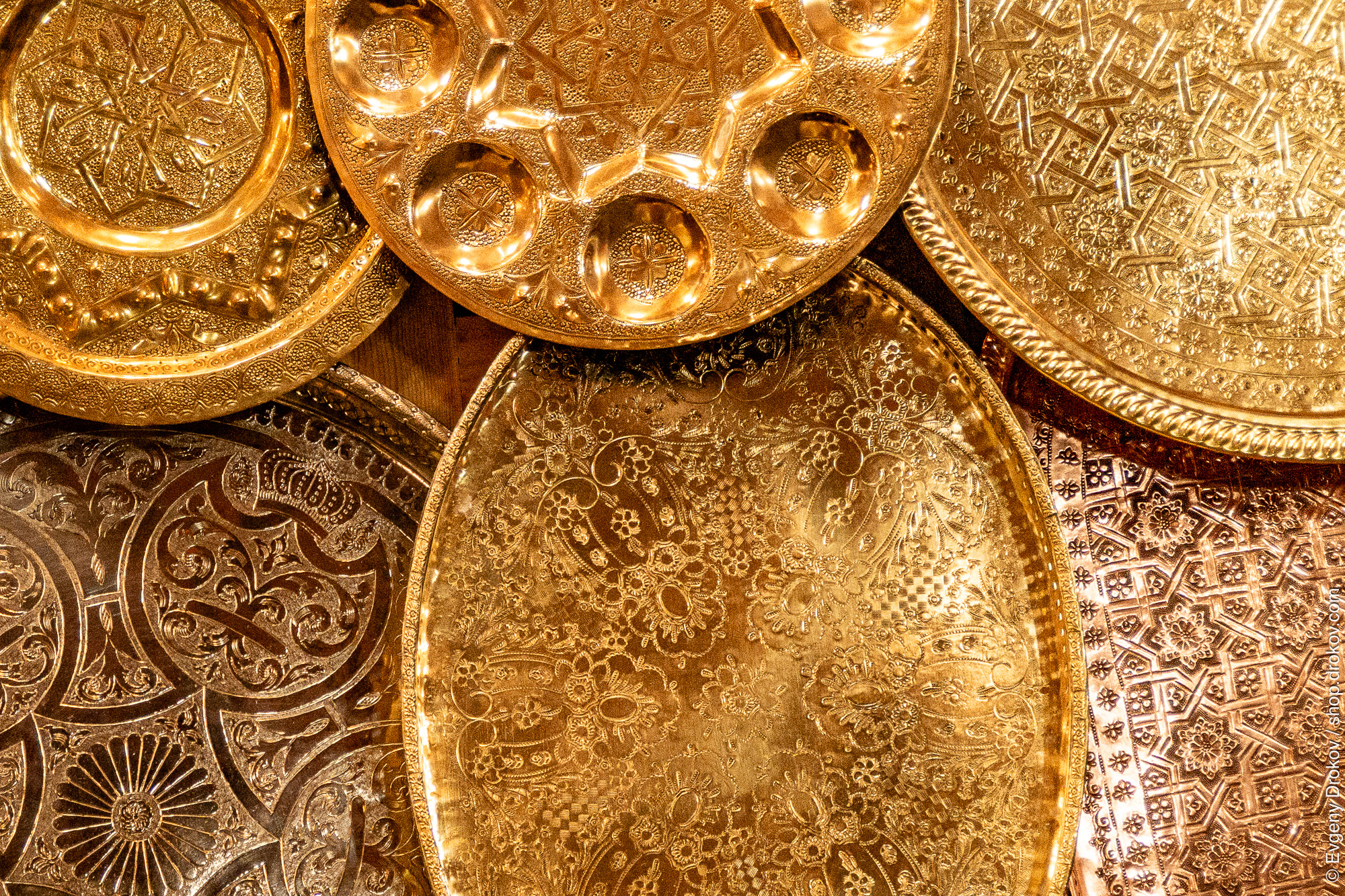 Intricate gold-toned trays, showcasing various decorative patterns. These handcrafted pieces are likely from a Middle Eastern market. The intricate designs highlight the artistry and craftsmanship.