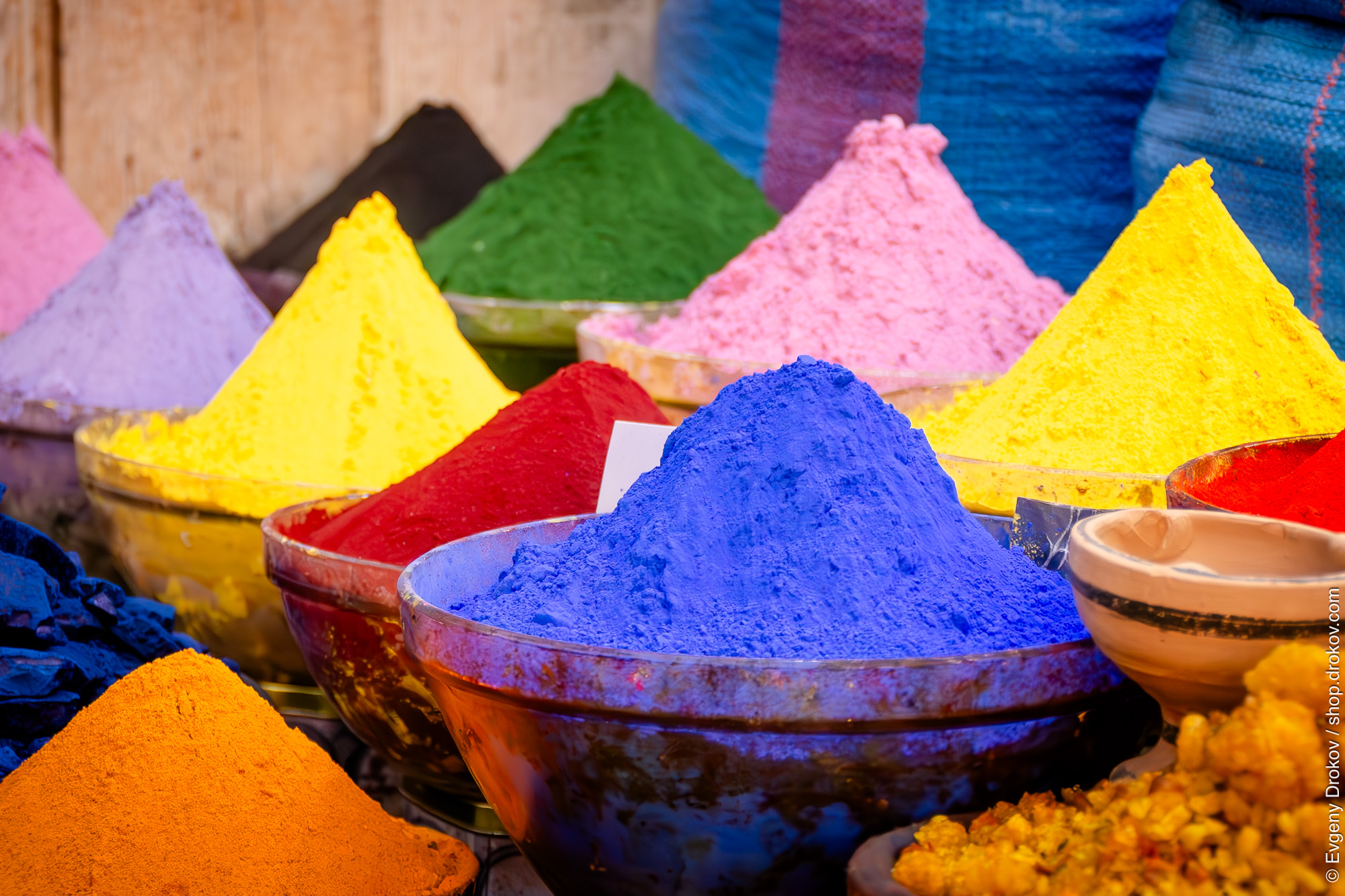 Vibrant piles of powdered dyes, various colors, are displayed in bowls. This is a market stall, showcasing natural pigments. The colors are used for festivals or crafts.