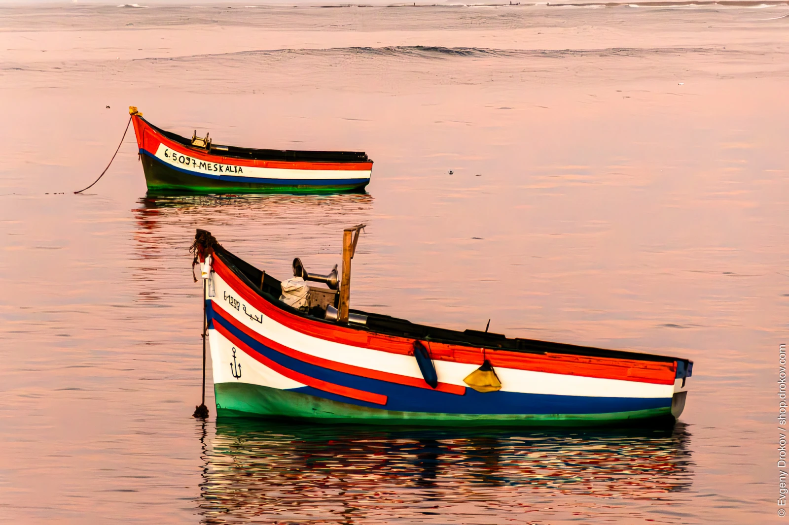 Two colorful fishing boats rest peacefully on the water's surface at sunset. The vibrant hues of red, white, and blue stripes on the boats, along with the calm water, create a serene scene. The boats are clearly traditional fishing vessels.
