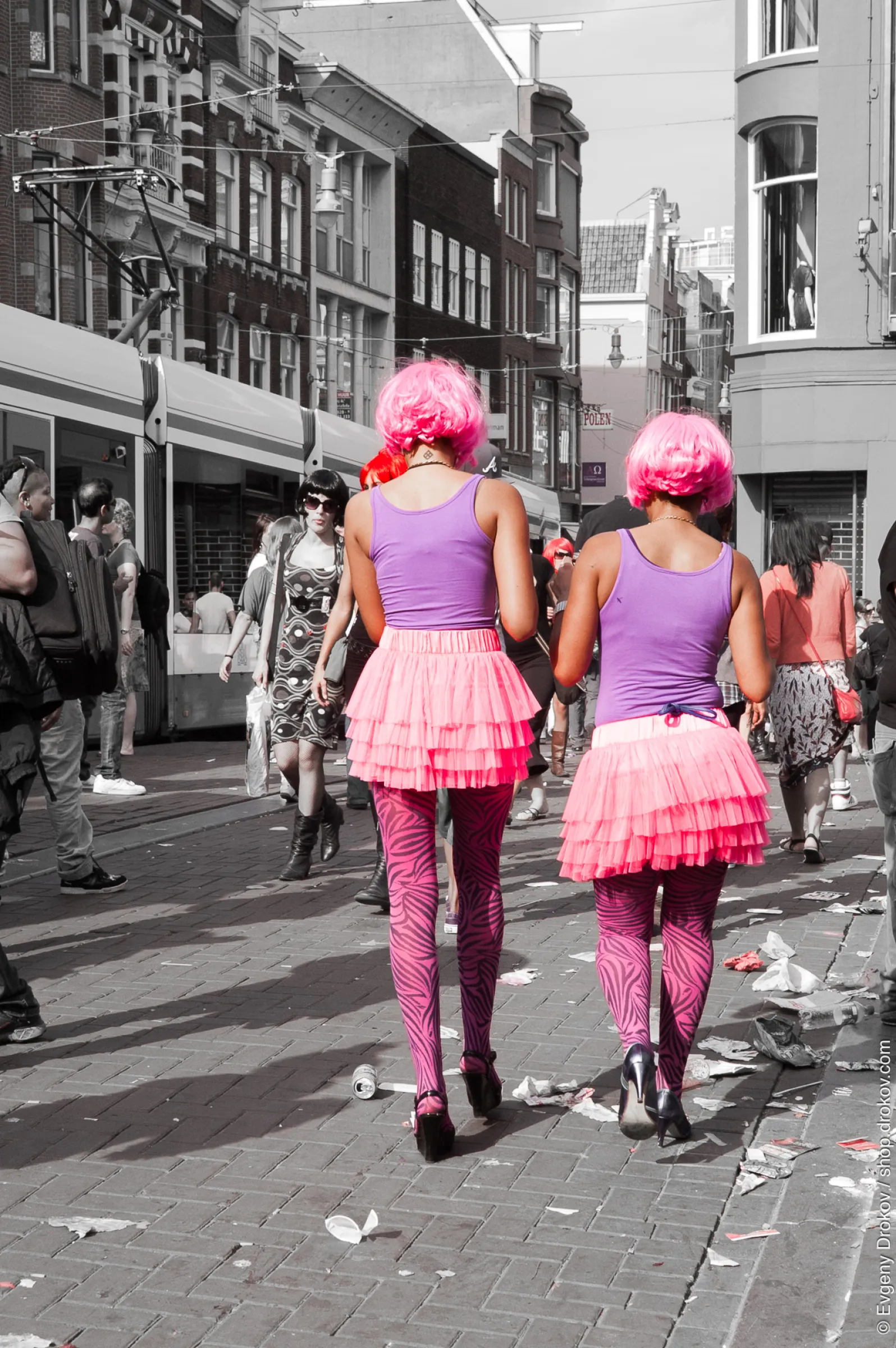 Two women, dressed in vibrant pink outfits, walk down a city street. Their pink wigs and matching skirts, paired with zebra-striped tights, are a striking statement. The street is bustling with other pedestrians, and litter is evident, suggesting a lively event or celebration.