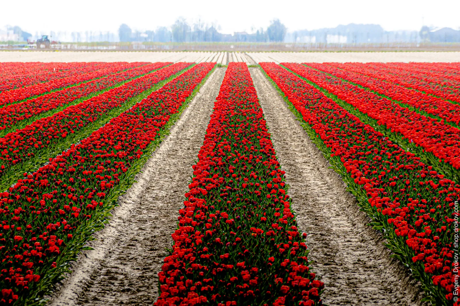 Vast rows of vibrant red tulips stretch across the landscape in Creil, Flevoland, The Netherlands. This expansive tulip field showcases the beauty of Noordoostpolder's renowned tulip cultivation, a testament to the region's agricultural prowess.