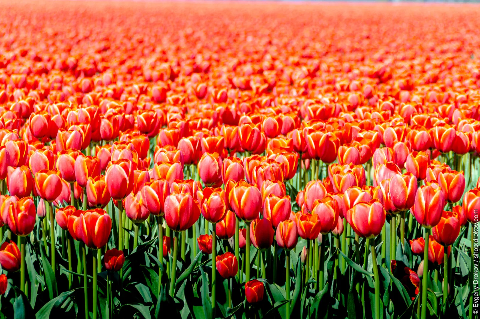 Vibrant red and orange tulips stretch across the landscape in Espel, Flevoland, The Netherlands. This expansive bloom showcases the beauty of the Noordoostpolder's renowned tulip fields, a testament to the region's agricultural prowess and a stunning visual spectacle.