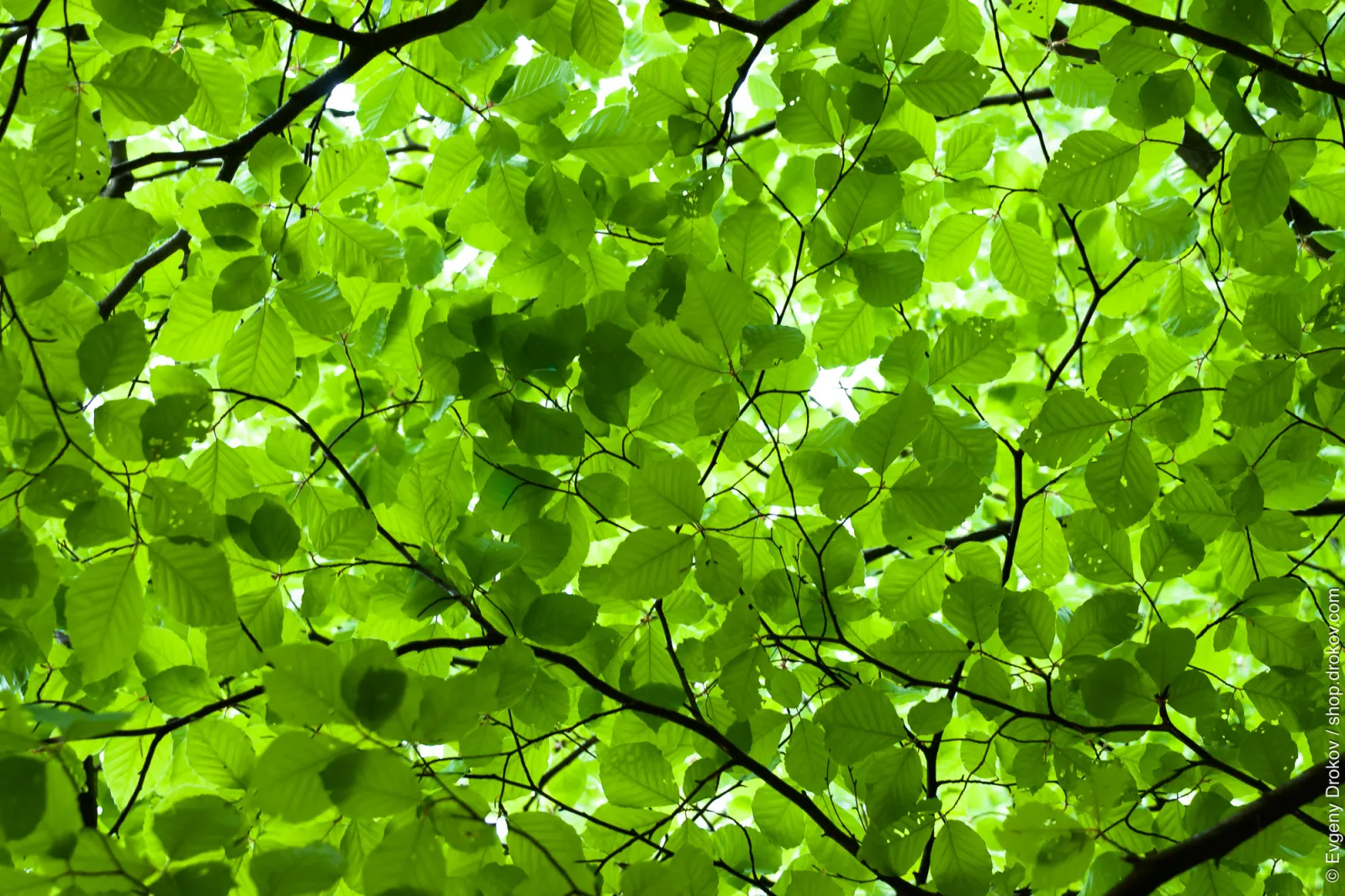 This is a close-up of vibrant green beech leaves and branches, captured from below. The natural light filters through the dense canopy, creating a serene and refreshing atmosphere. This artwork was created in Oosterbeek, Gelderland, The Netherlands, at Cardanusgronden.
