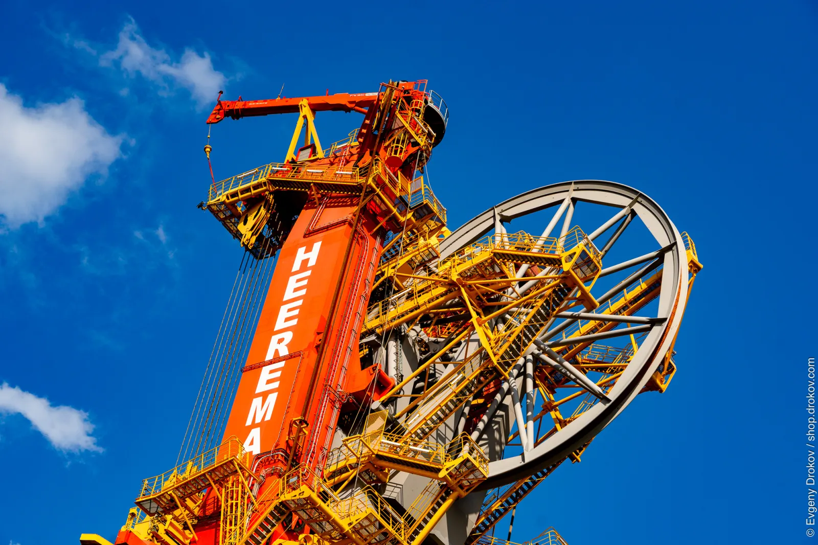 This is a close-up of the Heerema crane, a massive piece of industrial equipment, situated in the Port of Rotterdam, Zuid Holland, The Netherlands. Its imposing structure is captured against a clear blue sky, highlighting its scale and engineering prowess.
