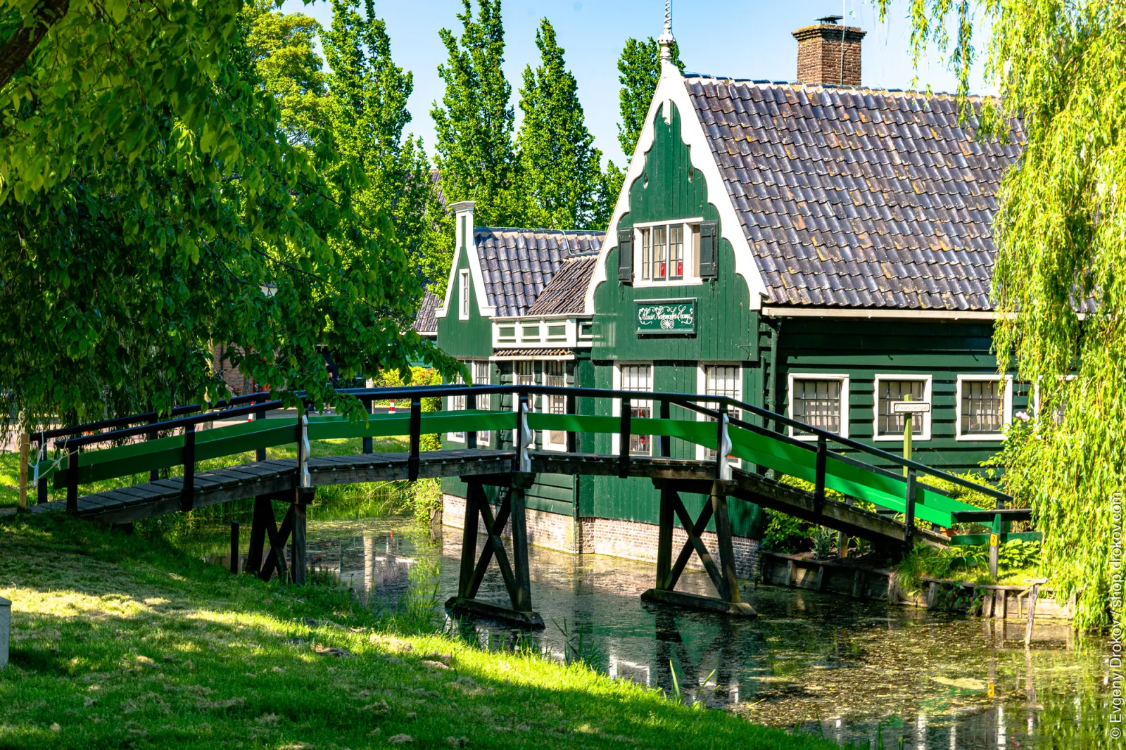 A picturesque wooden bridge crosses a tranquil canal in Zaanse Schans, North Holland, Netherlands. The vibrant green of the traditional Dutch houses and lush foliage creates a serene, idyllic atmosphere, showcasing the charm of this historic Dutch village.