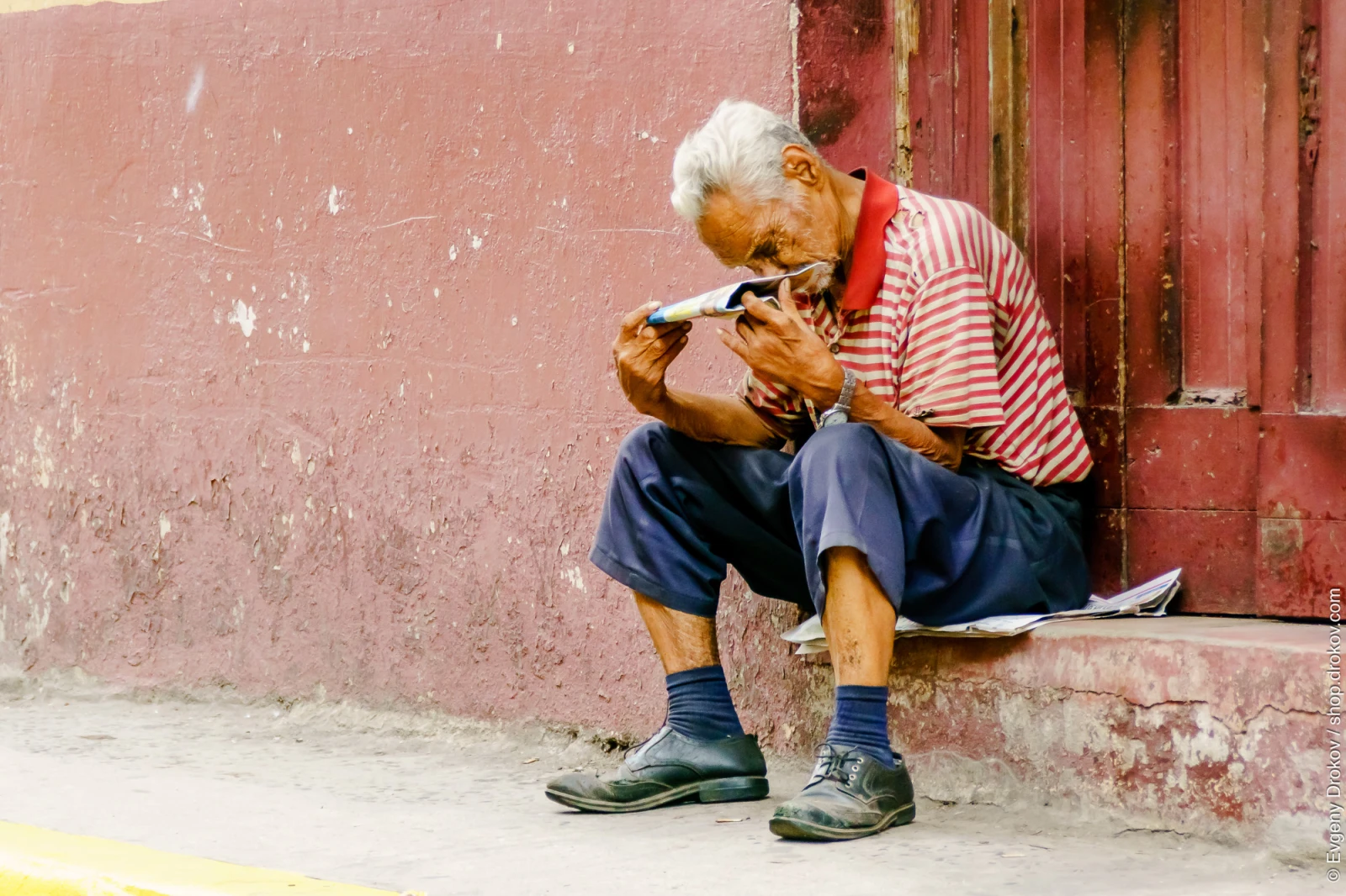 An elderly man sits on a step in Panama City, Panama, in September 2016, engrossed in reading a newspaper. This moment captures a quiet pursuit of information amidst the urban environment.