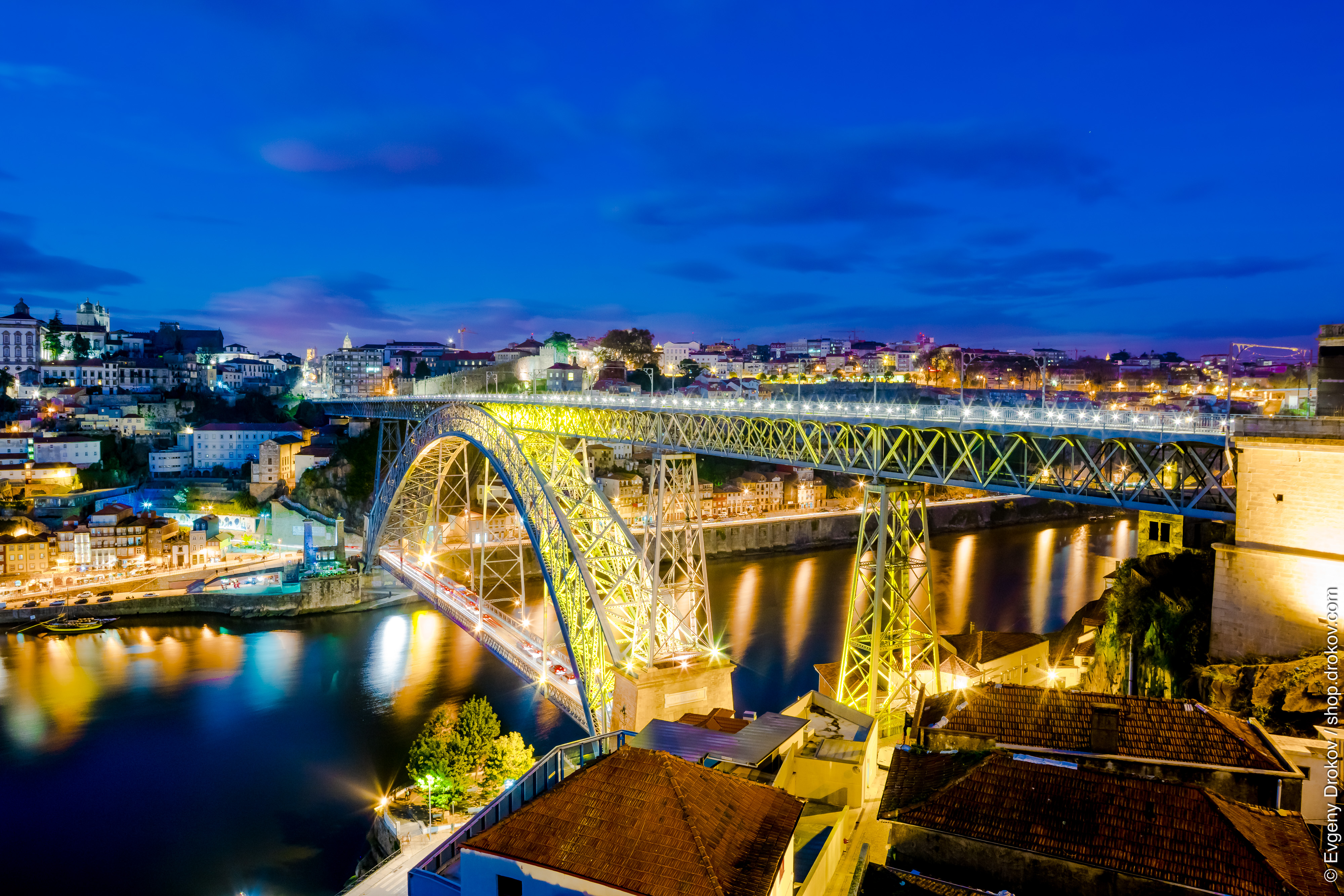 The Dom Luís I Bridge in Porto, Portugal, illuminated at dusk in November. This iconic landmark connects Porto and Vila Nova de Gaia, showcasing the city's historic architecture and vibrant nightlife.