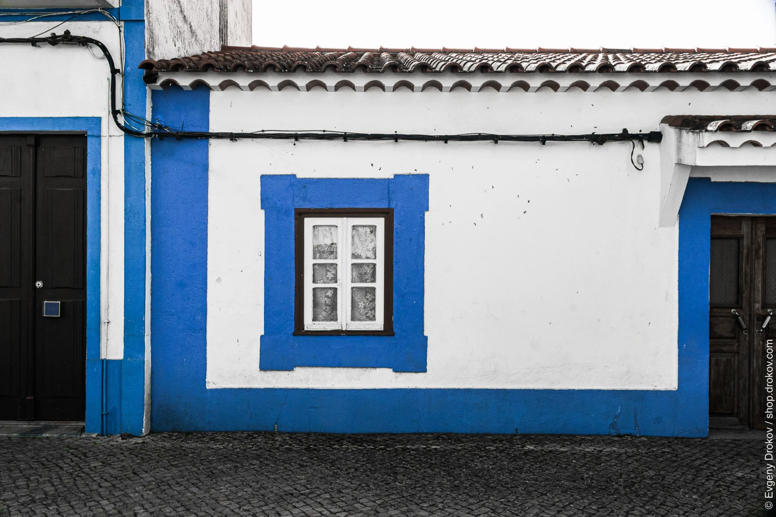 This is a detail of a traditional Portuguese house in Santa Clara-a-Velha, Beja, Portugal, captured in October. The stark white and vibrant blue facade, accented by a tiled roof and cobblestone street, showcases the region's architectural charm.