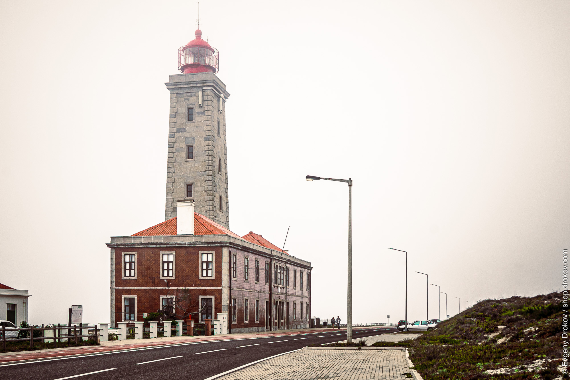 The iconic lighthouse of Marinha Grande, Portugal, stands tall against an overcast October sky. Its imposing stone structure and red-capped lantern serve as a steadfast beacon, a testament to maritime history and a vital navigational aid for ships.