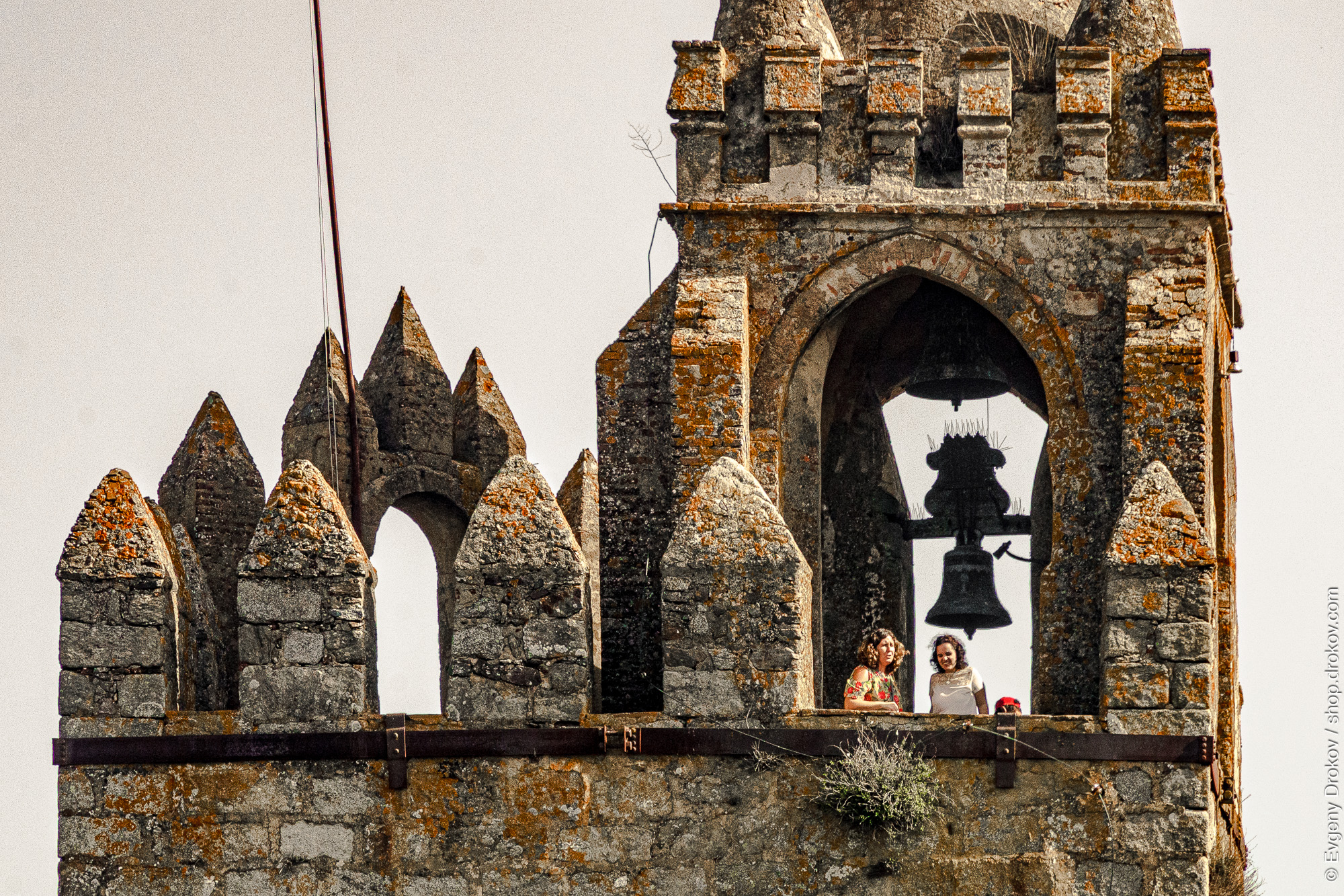Two women stand within the bell tower of a historic church in Montemor-o-Novo, Portugal, during October. They are observing the surroundings from this elevated vantage point, capturing a moment of shared experience against the backdrop of ancient architecture.