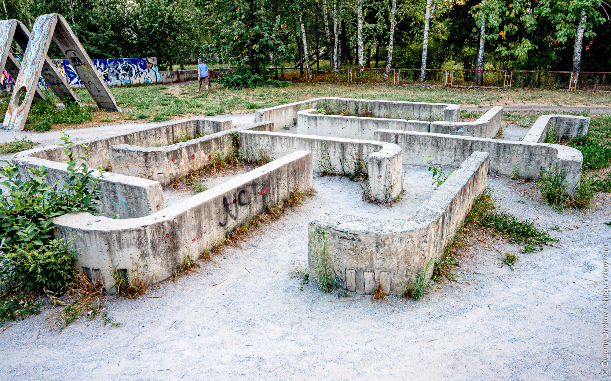 A concrete maze, overgrown with weeds, sits in a neglected park. Graffiti adorns the walls, showcasing the area's history and the impact of urban life. This abandoned playground highlights the contrast between planned design and the natural world reclaiming it.