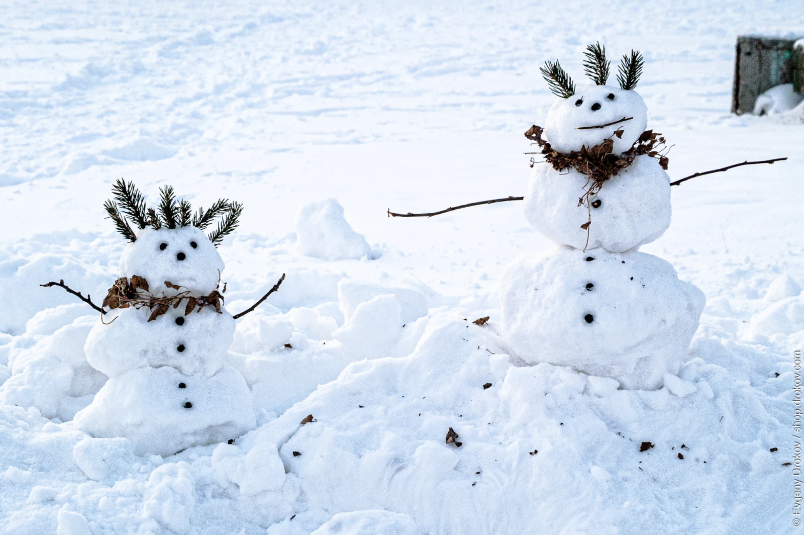 Two snowmen, crafted with pine sprigs for ears and dried leaves for adornment, stand proudly in Krasnoobsk, Russia. Their creation signifies a moment of winter joy and creative expression amidst the snowy landscape.